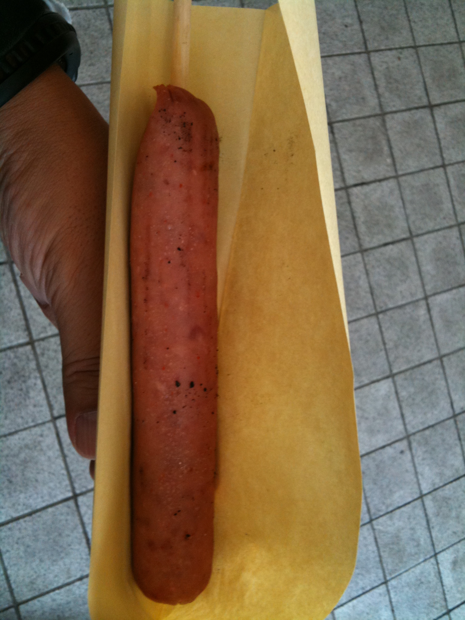 ウインナー300円。ピリ辛でした。 11:00に出発して名古屋着が16:20。途中ぐっすりで順調、順調。 スタジアムに何が売ってあるか分からないので駅の食堂で腹ごしらえです。