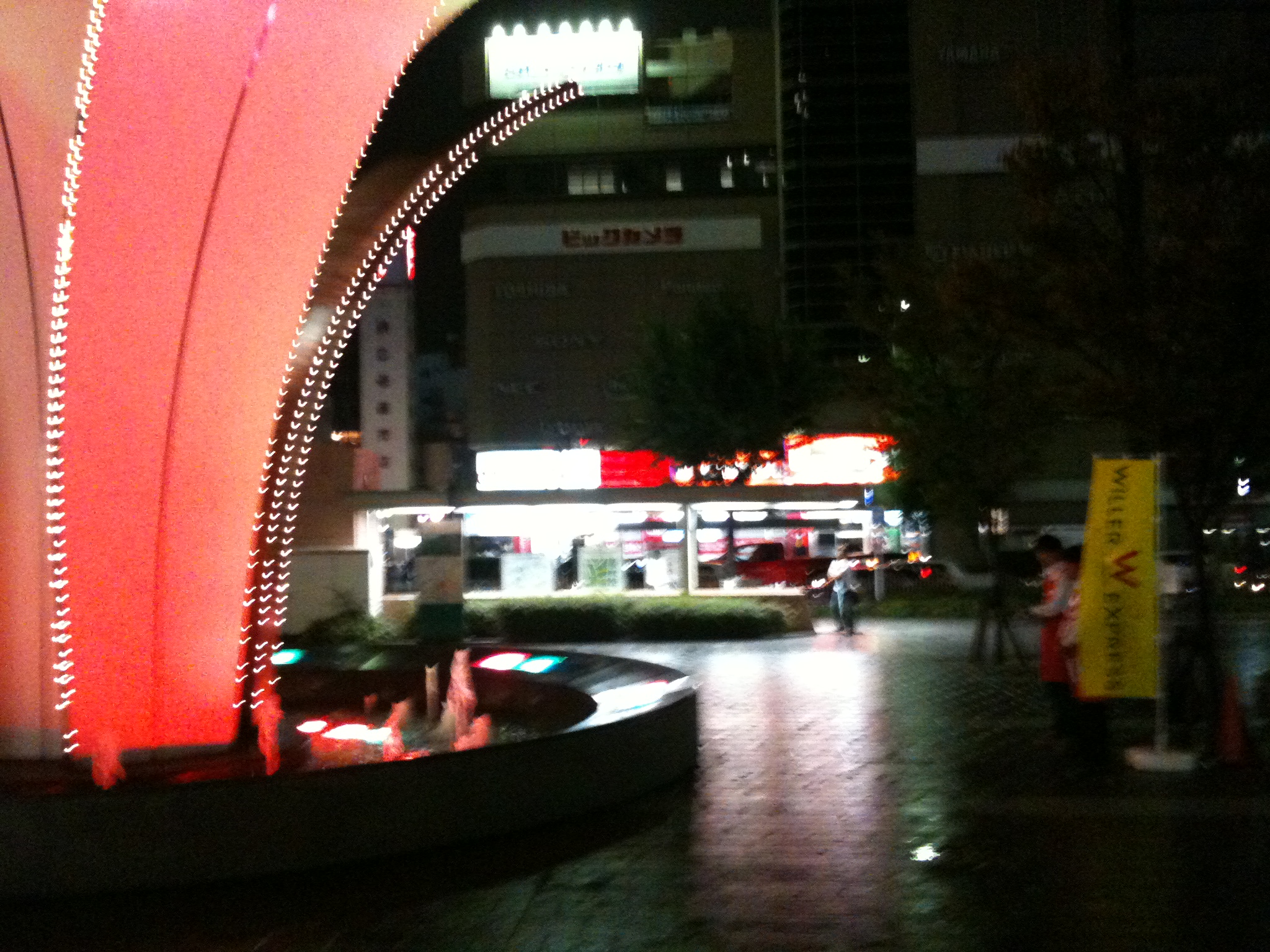幕切れのあっけなさにびっくりしていたら、いつの間にか名古屋駅に来ていて、帰りのバスが待っていました。 集合場所はゆりの噴水、右にノボリが出ていて係の人が待っていました。