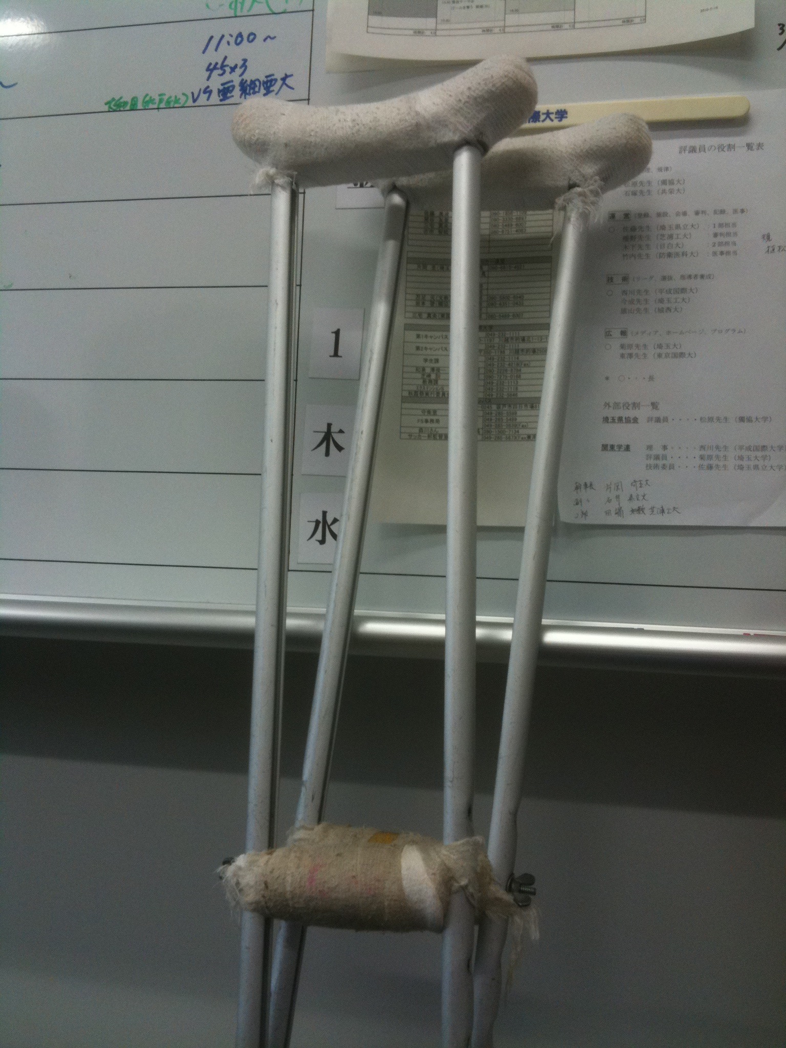 うーん、こんな落とし穴があるとは……。体が冷えていたんですね。右臀部に近いところの肉離れです。いてててて(x_x) まぁ、すぐに上原コーチから適切な処理をしていただいたので、今日は松葉杖でしたが、明日には回復できるでしょう(-。-;)