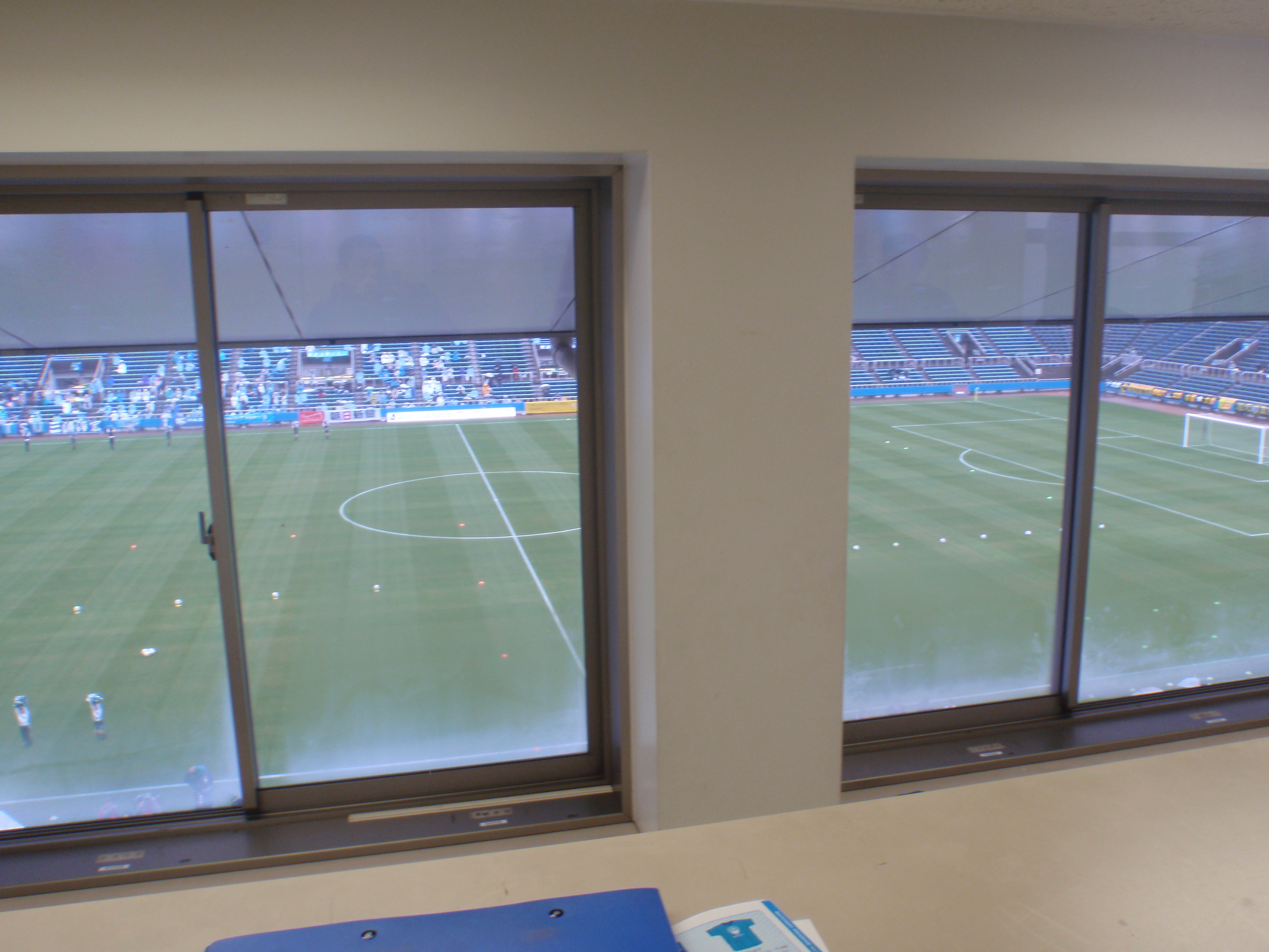 ドーンと視野の一部を占める大きな柱。外だと濡れてしまうのでノートが取れず、かといって中の記者席に座ると、この柱と格闘することになります。柱を避けるためにみんなで左右に動きます。ボールが落ち着かないとすごい勢いで左右にうろうろすることになり、取材しながら体力強化も出来るという考えです。違うか。