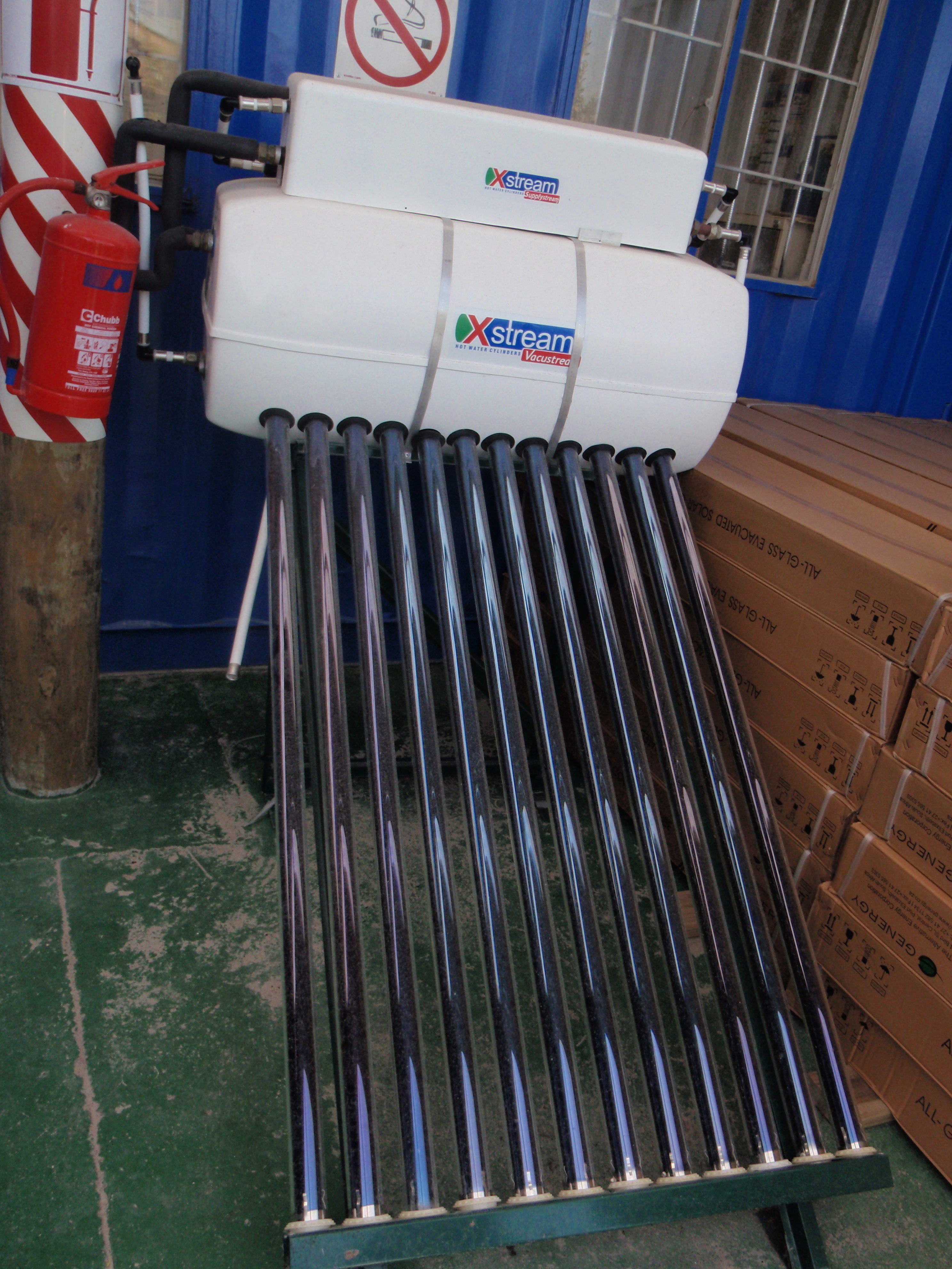 これが屋根の上に設置された太陽温水器です。中国産だと3500ランド(約4万2000円)で、地元産だと4100ランド(約4万9000円)。
