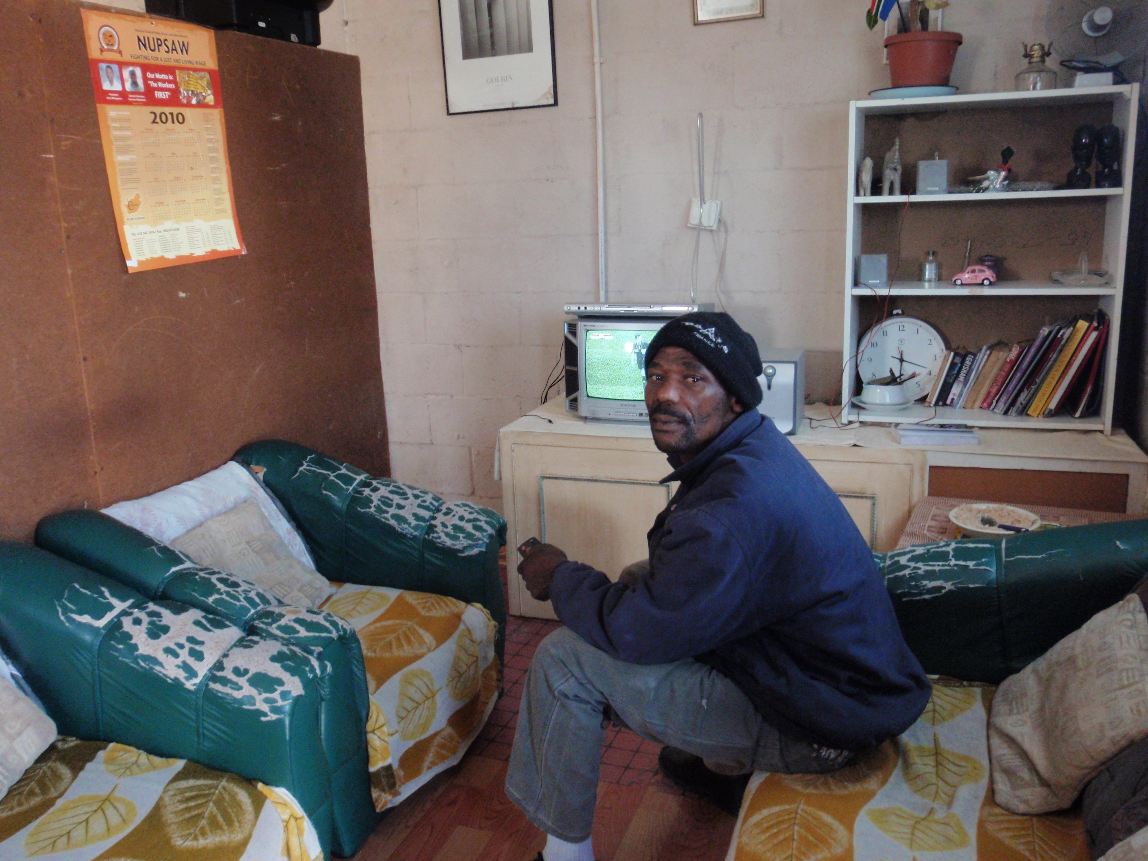 これがコンテナハウスの中です。半分に区切ってベッドルームも作ってあり、シャワールームもあります。電気はプリペイド方式で、使用料限度に達すると電気は遮断されるそうです。