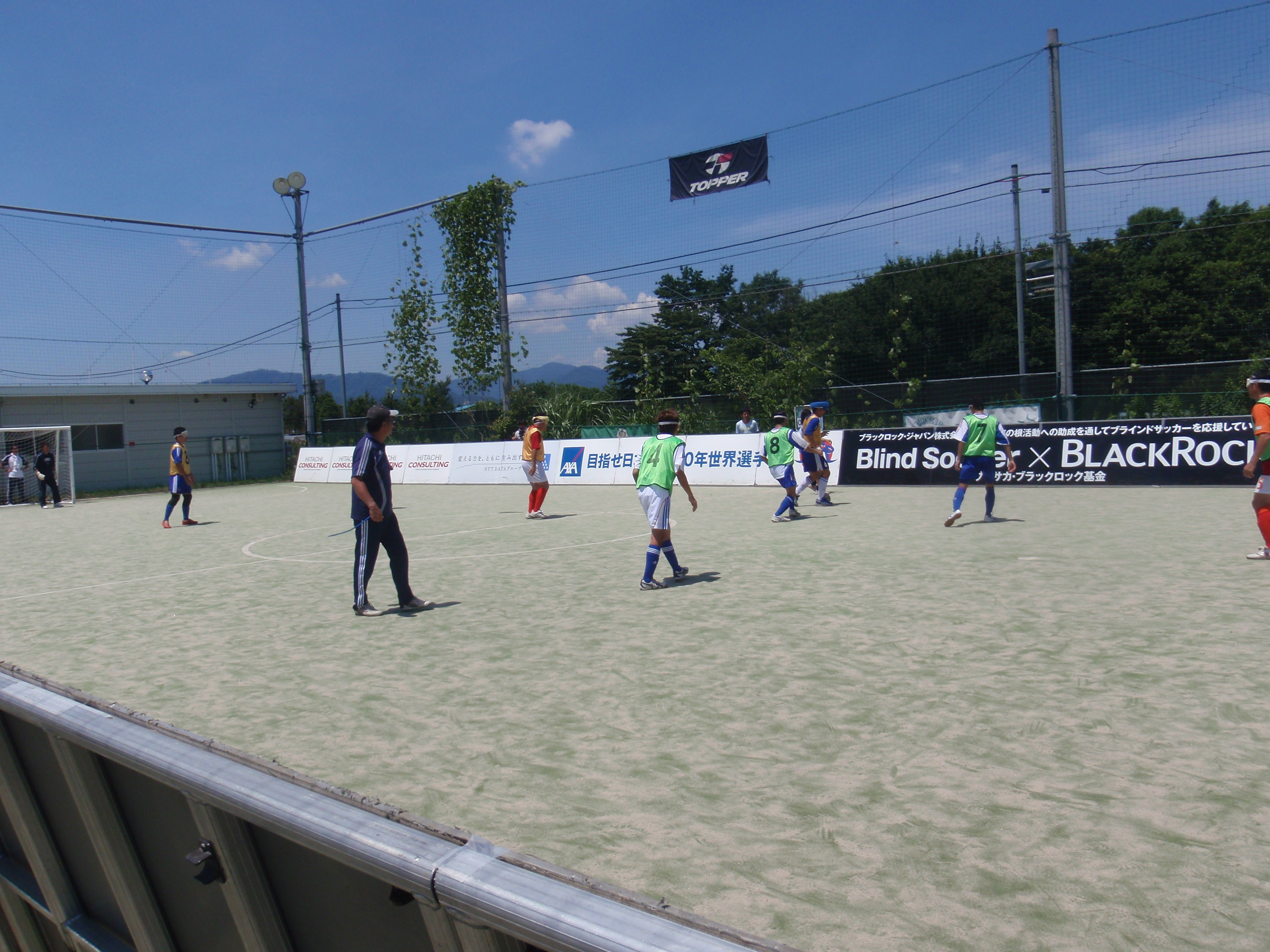 ところで、このピッチの横にある看板はすべてブラインドサッカー用で、サイドラインのところにおいてあります。これでサイドラインを越えないようにしてあるのです。練習後にはチームスタッフやボランティアの人が片づけます。これは結構大変な作業です。いつもボランティアの人がいるわけではないので、そのときは本当に苦労してます、というお話でした。