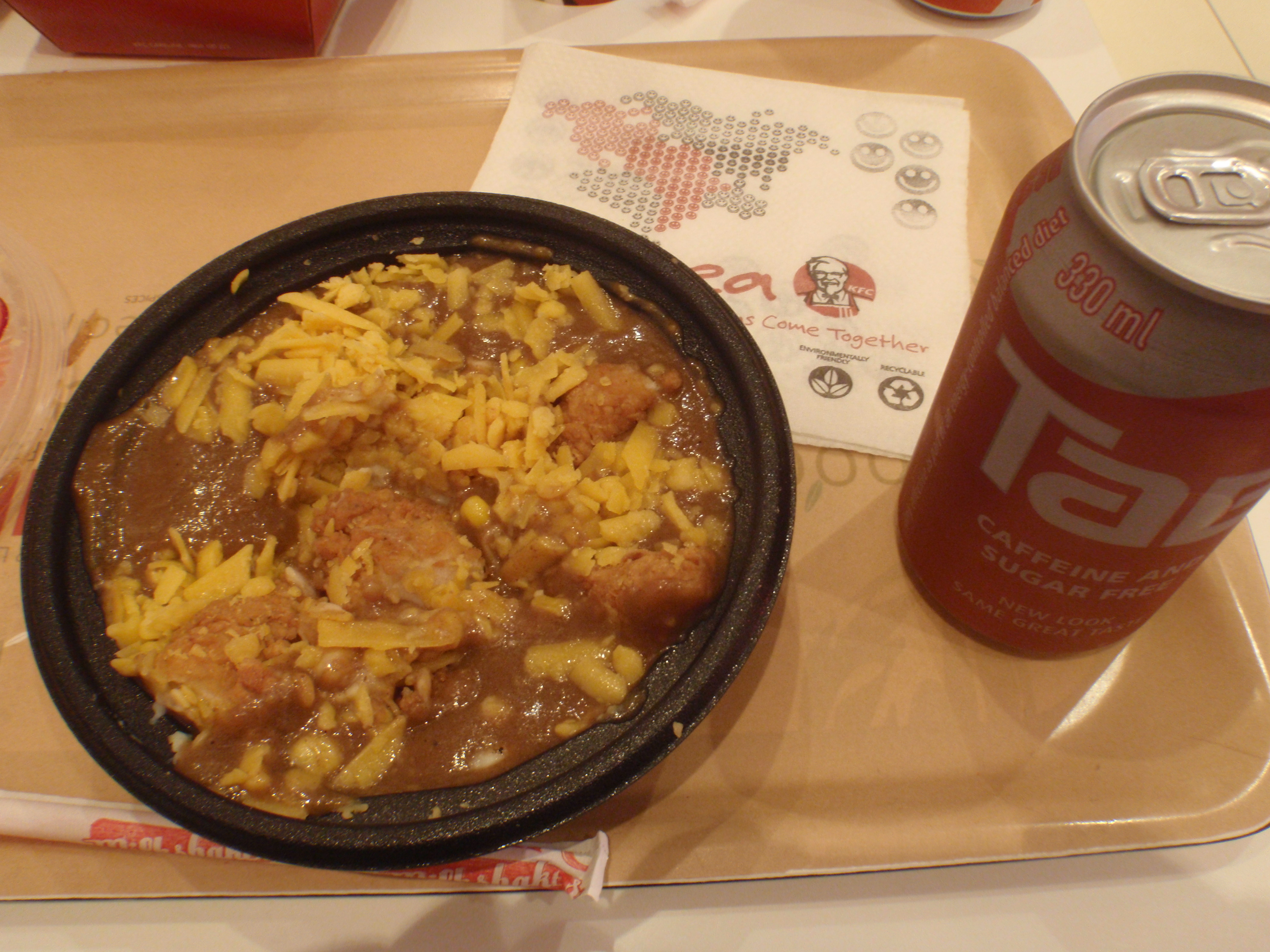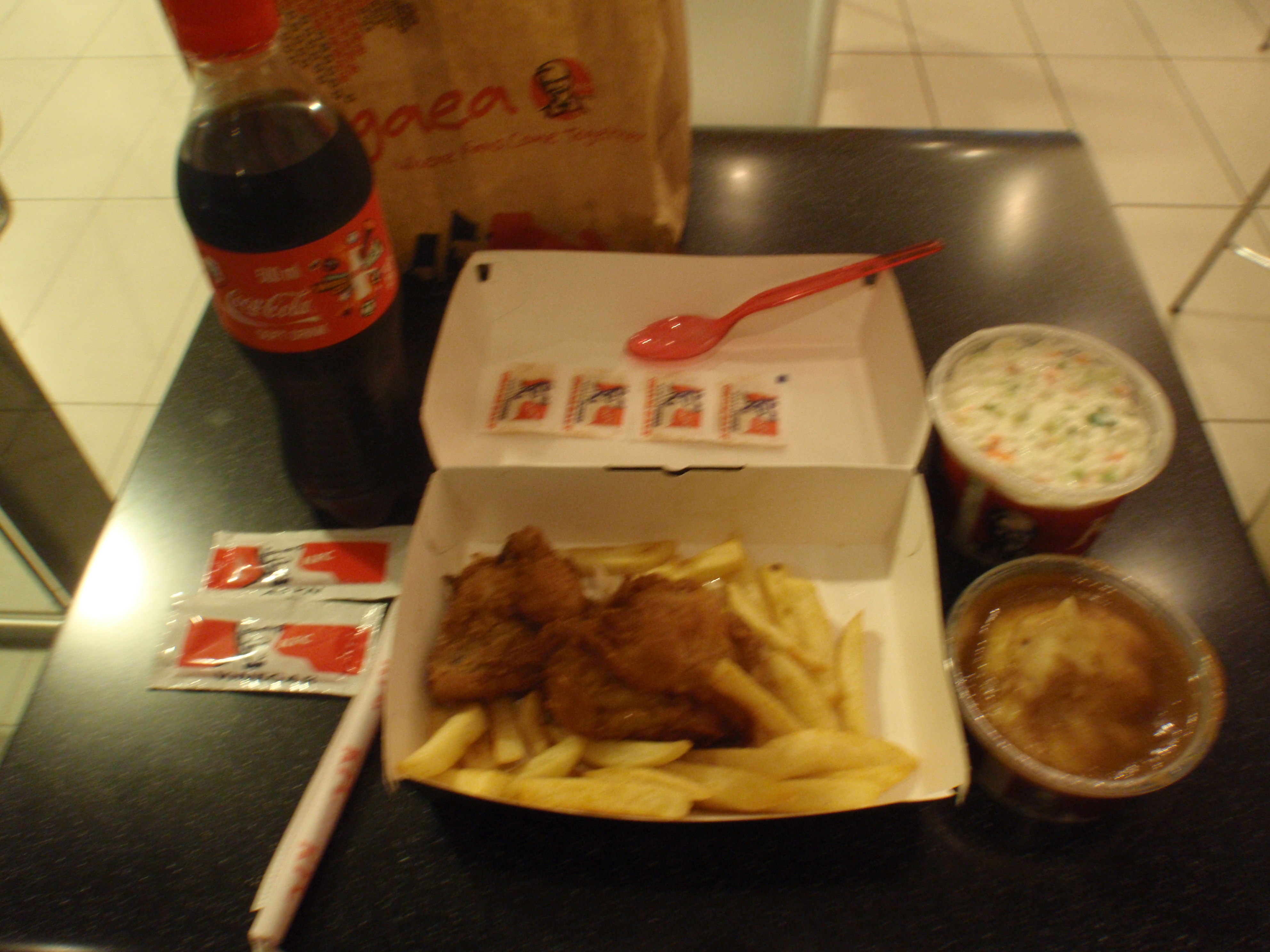 それから、海外ではケンタッキーが安いんです。これはケープタウンの空港で食べたセットメニュー。これだけついて50ランド(約650円)。