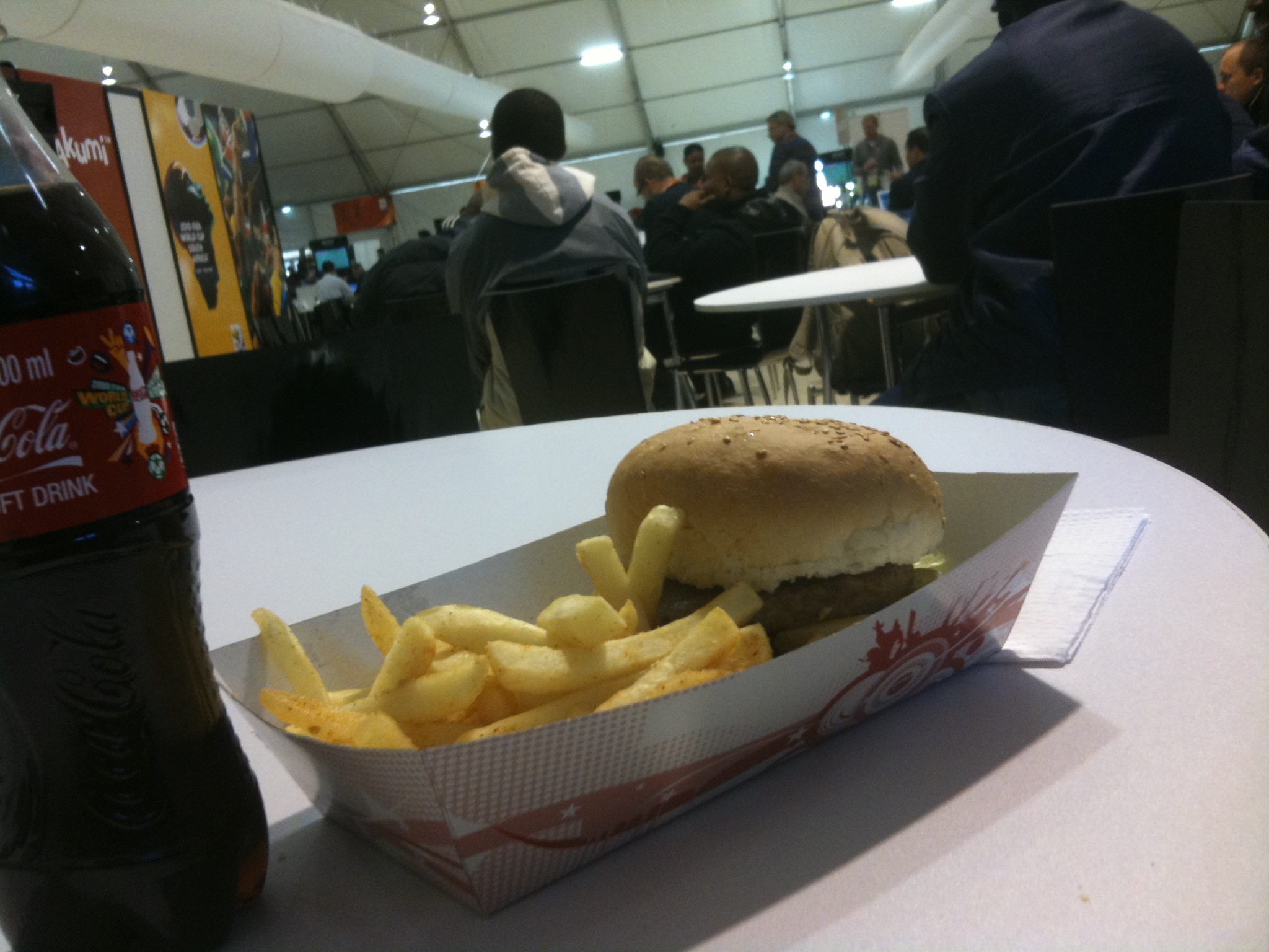 ハンバーガーが35ランド、ポテトが10ランド、コーラが15ランドの合計60ランド(約780円)。ハンバーガーには一枚レタスが挟まっています。肉は分厚いけど味は淡泊。