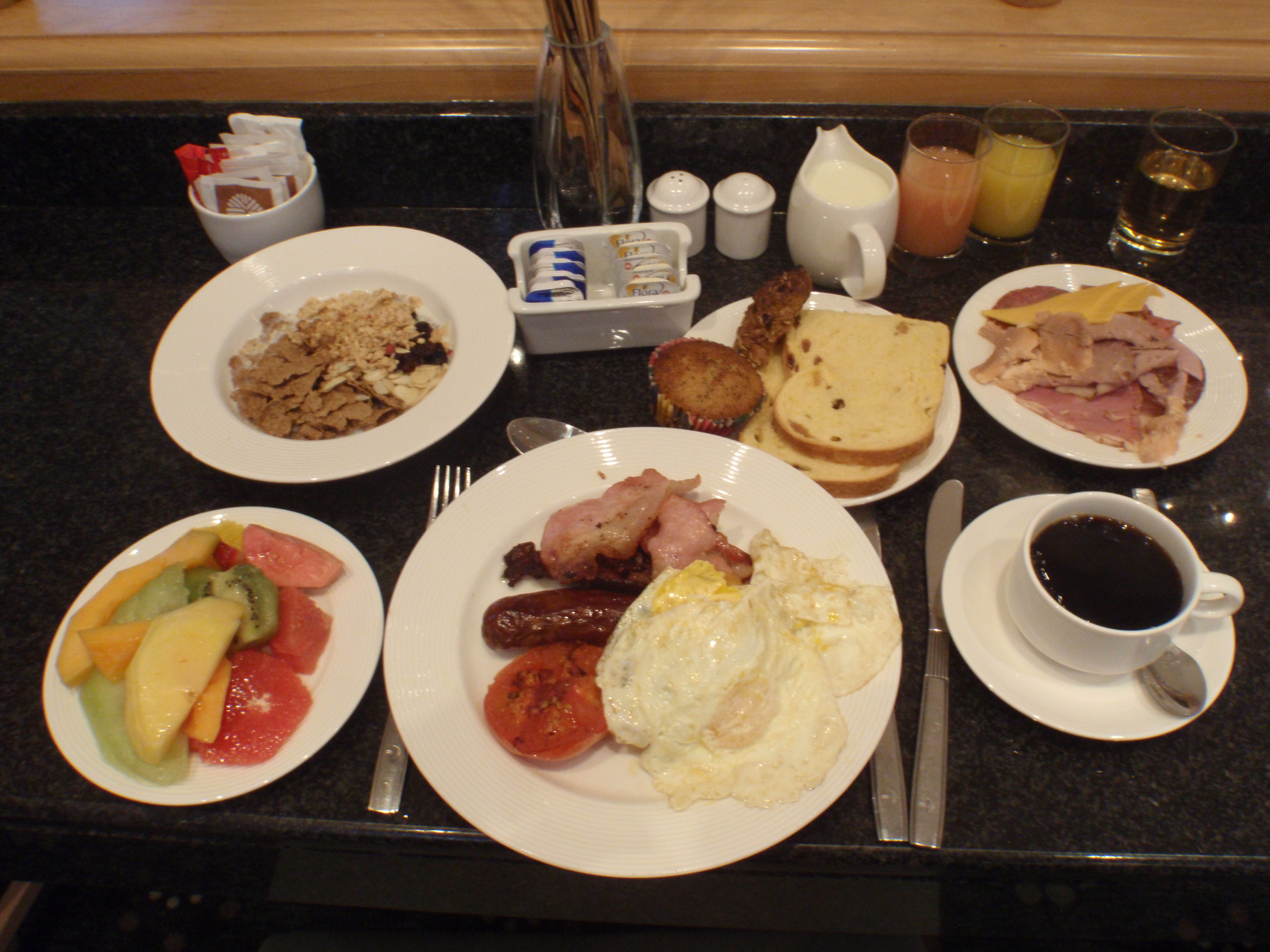 真ん中のプレートはコックさんに卵の数やベーコンとハムの枚数などを言って調理してもらいます。自分の前のドイツ人がかなり盛ってもらって、こちらを向いて「ふふんっ」と言ったので、思わず「今のドイツ人より一つずつ多くしてくれ」と言ってしまいました。