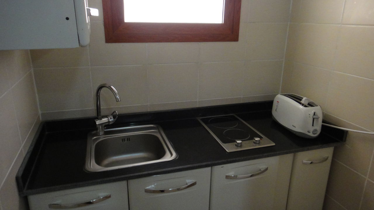 キッチン付き。トースターも冷蔵庫も電子レンジもあります。
