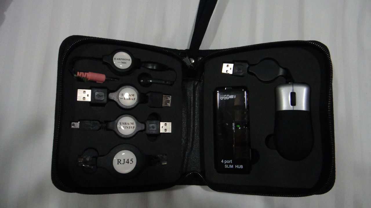 黒いバッグの中にはコンピュータ関連のケーブルやハブ、コンパクトマウスなど。確かにこれは便利です。
