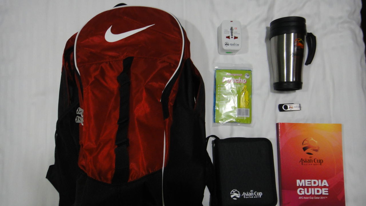 メインはもちろん右下のメディアガイド。取材に関するいろいろな情報が掲載されています。それを入れるナイキのバッグが配られただけでもおどろきだったのに、中にはUSBメモリー、ユニバーサル電源アダプター、マグカップ、そしてなぜかポンチョなどが詰まっていました。