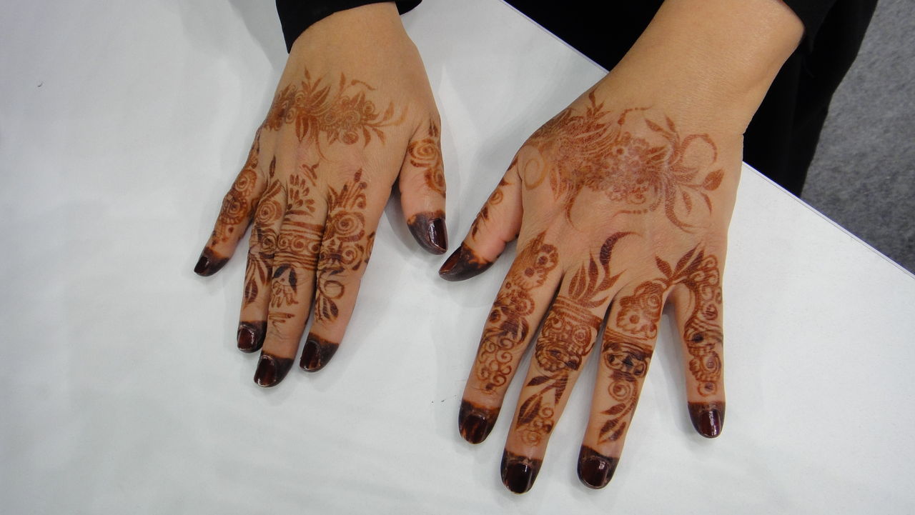 「ヘナ」を使って模様が描いてあります。「ヘナ」って日本だと白髪を自然に染めるシャンプーに入っている植物由来の成分で、描くとしばらく模様が残るのですが、次第に薄くなっていくんです。それを使って手をアートにしていて、これがベールと相まって美しいっす。