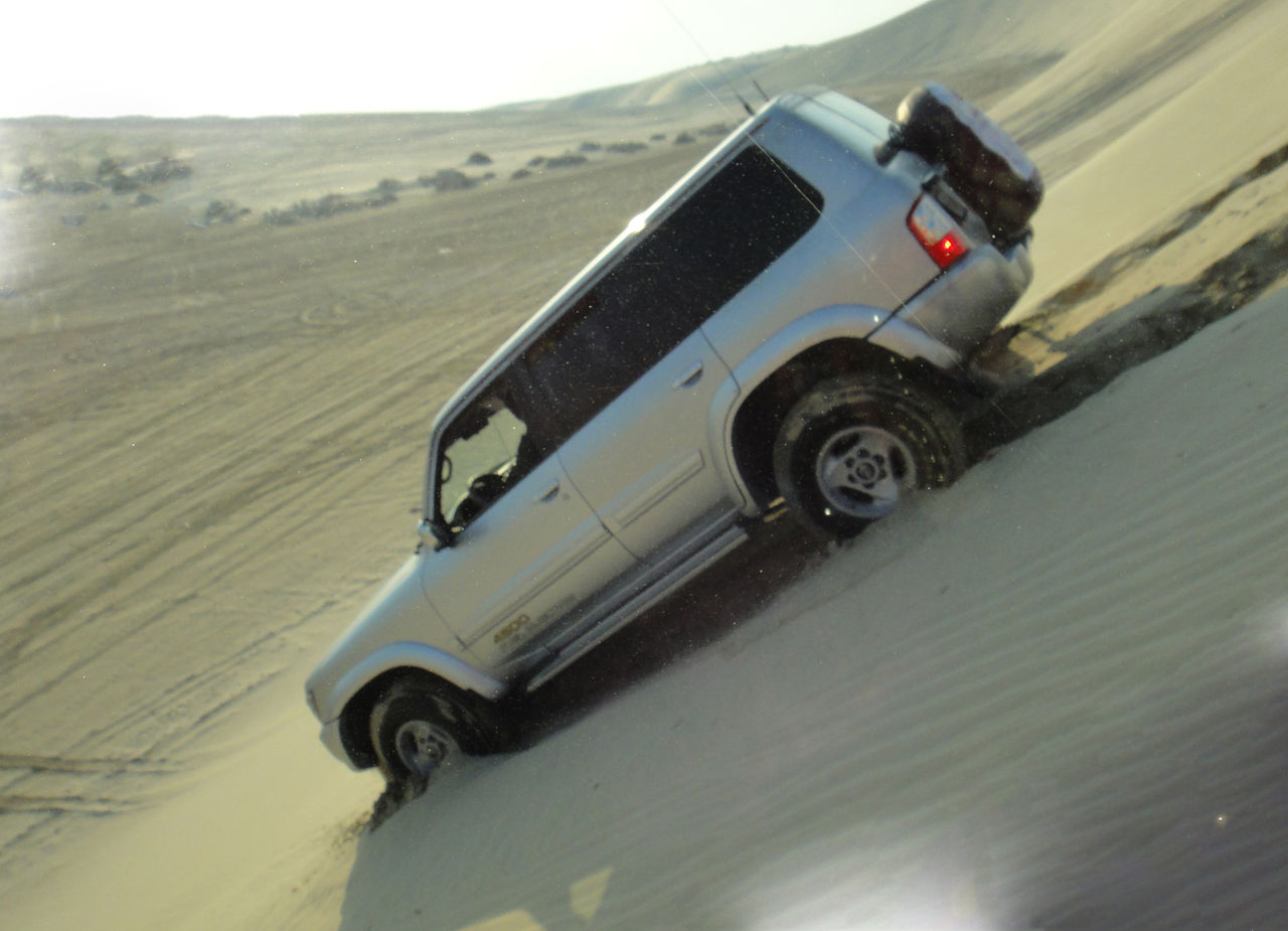 これだけでは終わりませんでした。同じような急斜面を今度はバックで滑っていきます。ひぃー!! 写真を撮る余裕なんかありません。さ、砂漠ツアーに期待したのは、こんなんじゃないから~!!