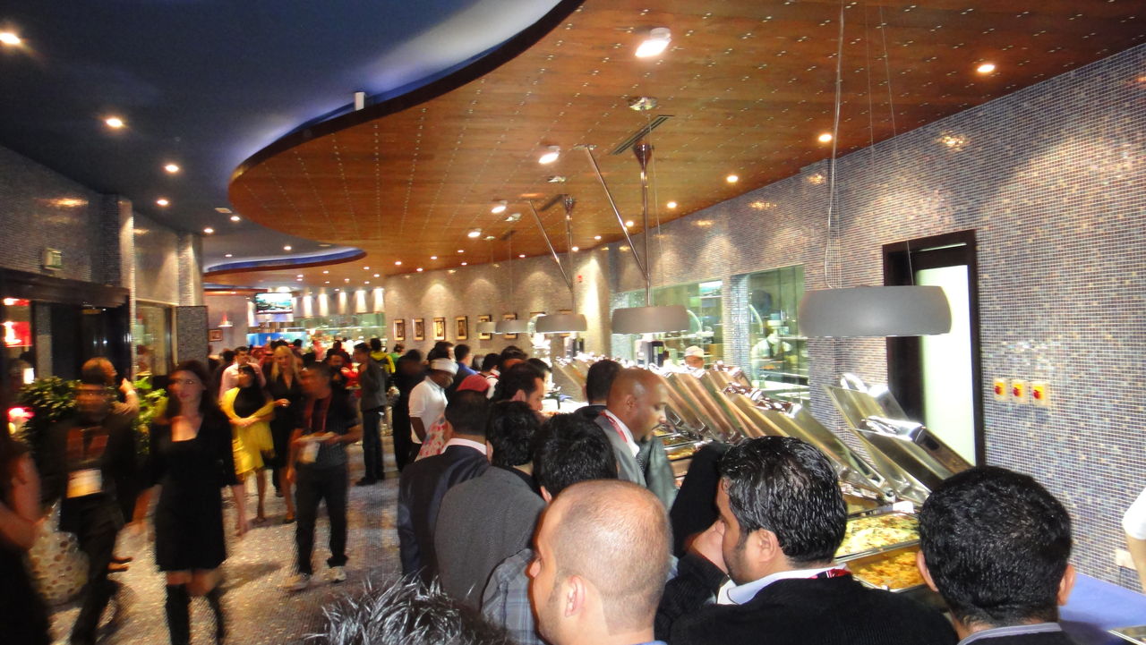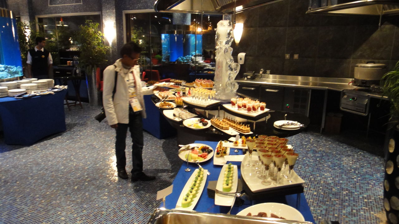 すると係の人がやってきて、別の場所に案内してくれました。どうやらボランティアの人たちもやってきて、みんなで食事のようです。ビュッフェ形式のレストラン、ワイワイがやがやとすごい賑わいです。