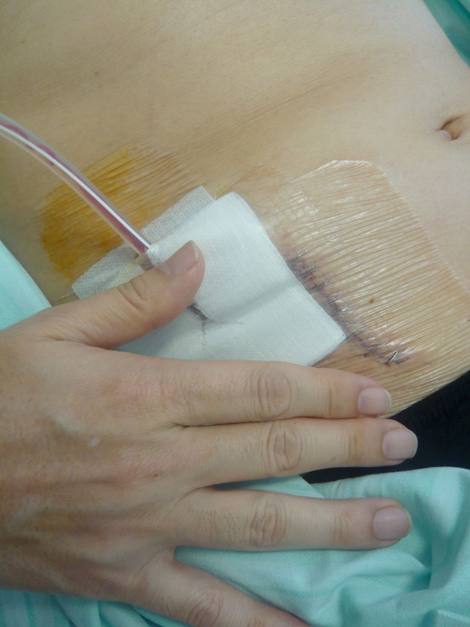 こじらせてしまったため、大きな傷口になりました。親指のところからは管が出ていて、おなかの内の液体の様子を観察することになりました。