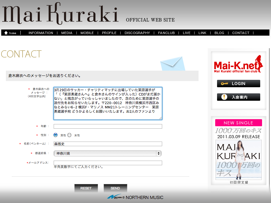 先日のブログに栗原勇蔵選手が倉木麻衣さんからまだCDをもらっていないと書きました。栗原選手から「(倉木さんに)言っておいてください」と言われたものの、どうすりゃいいのか途方に暮れていたところ、親切な方から、倉木さんのオフィシャルサイトからメール送信ができると教えていただきました。