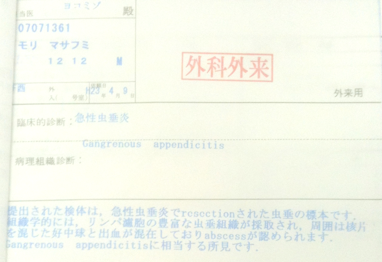 最後に、大きく腫れていた虫垂の検査結果を聞いてみました。そこで見せていただいたカルテがこれ。