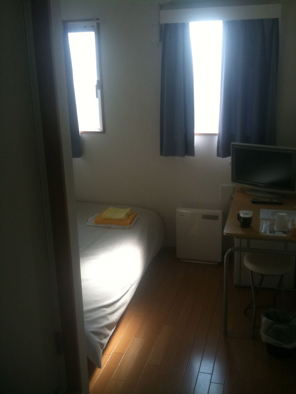 ……シンプルです。ベッドは昨日の3分の1ぐらいの大きさ。たぶん部屋は5分の1ぐらい。