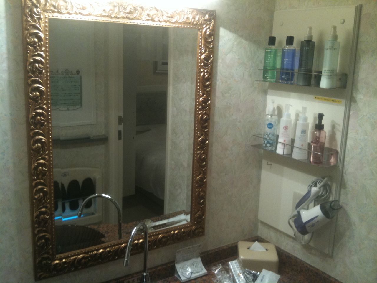 充実のアメニティ。とことん至れり尽くせり。これで一泊3990円でした。だけど翌朝出るときが恥ずかしいなぁ。フロントに電話してから降りてきてくださいっていわれました。もしかして、他のお客と鉢合わせしないためでしょうか。