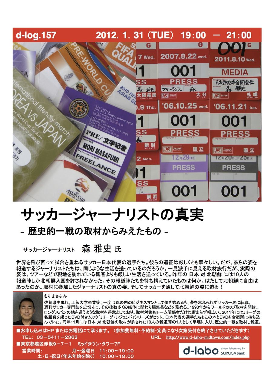 というイベントを3月1日、六本木で「行う」ことになりました。会場はd-laboさん。佐山一郎先生にご紹介いただきました。本当は「貧乏サッカージャーナリストの真実」って内容なんです(汗)。あ、平壌に行ったときの話をたっぷりできると思います。申し込み方法などの詳細が決まりましたら、またお知らせいたします。よろしくお願いいたします。