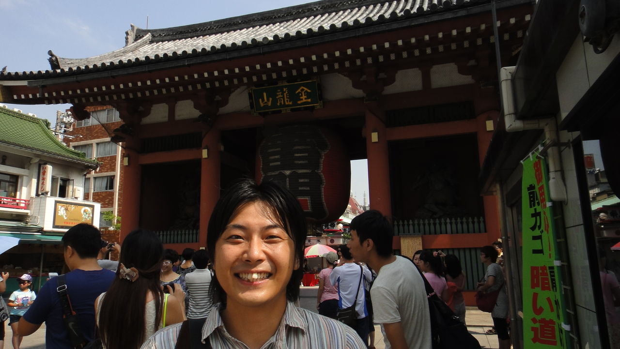 雷門です。僕は観光ライターになります。名所を巡って素敵なスポットをみなさんにご紹介。今日は浅草雷門付近で、じっくりと汗を流せるスポーツスポットをお知らせします。ウソです。