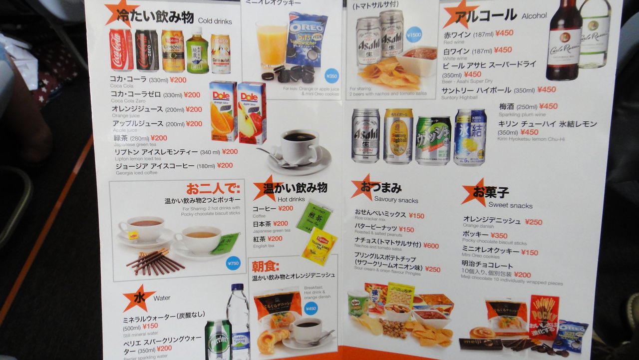 LCCですから、飲み物や食べ物にお金がかかります。メニューはこれ。