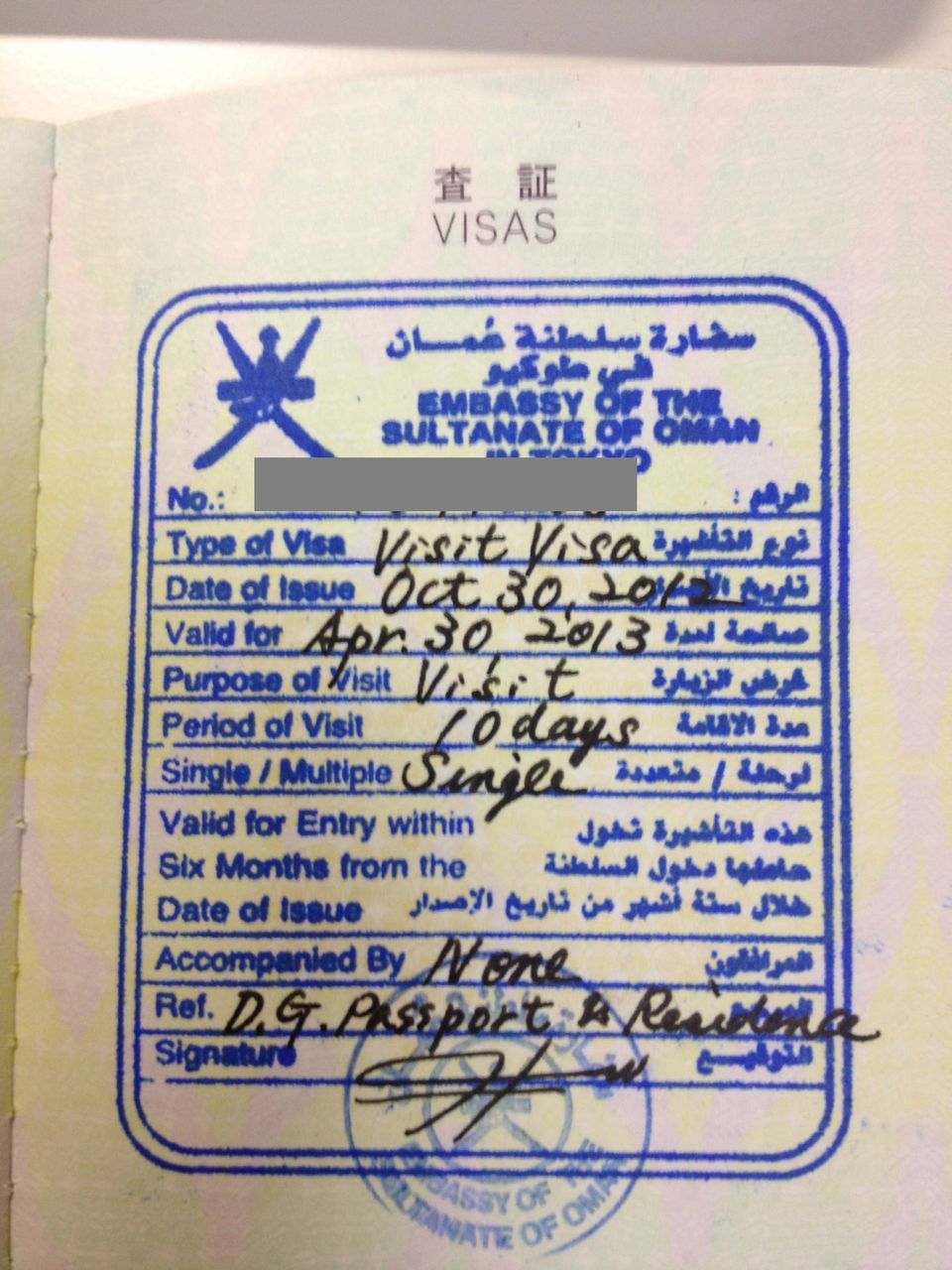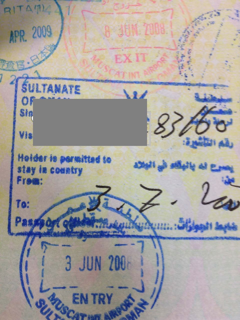 本日、オマーンのビザが無事発行されました。2008年は到着した空港のその場でビザを発行してもらえたのですが、今回は事前にパスポートにハンコが押されています。
