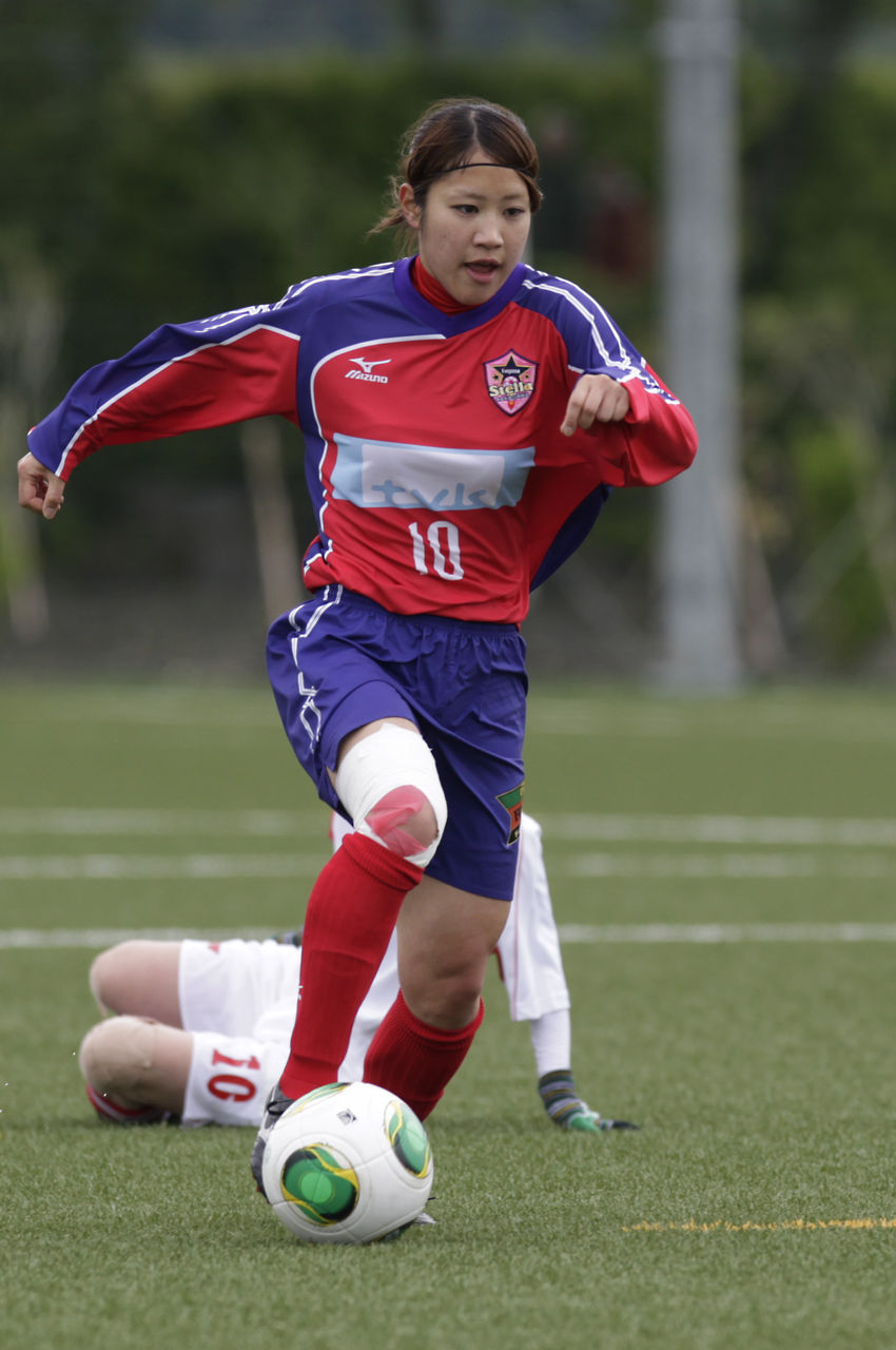 ノジマステラの最初のきれいなシュートは21分。後藤選手が右からクロスを送り、中央で井上選手が会わせます。このシュートをきっかけにノジマステラのフィニッシュの形ができはじめ、ついに34分、金井選手が河原崎選手を走らせ、その折り返しに井上選手がスライディングで合わせて先制点を奪いました。