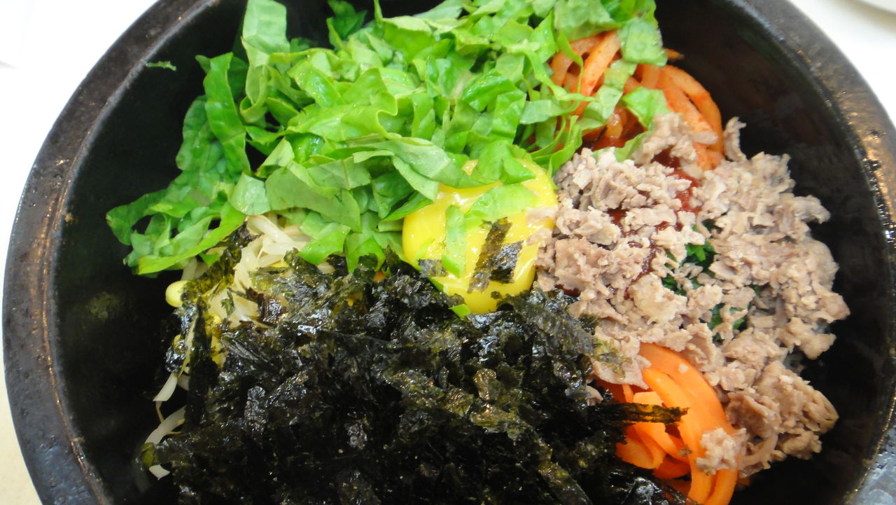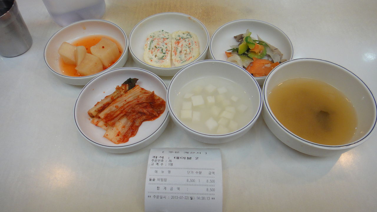 カクテキ、キムチ、絶品です。この石焼きビビンバと付け合わせで8500ウォン(850円)。