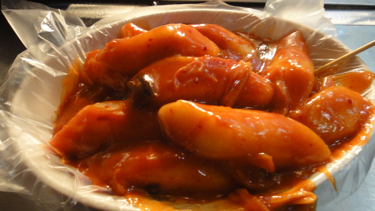 もちもちがたっぷりでおいしい!! 2500ウォン(約250円)で、たっぷり食べられました。お皿に敷いてあるのはポリの袋で、持ち帰りはさっとこれで包んでくれます。お皿を洗わなくてすむ工夫です。