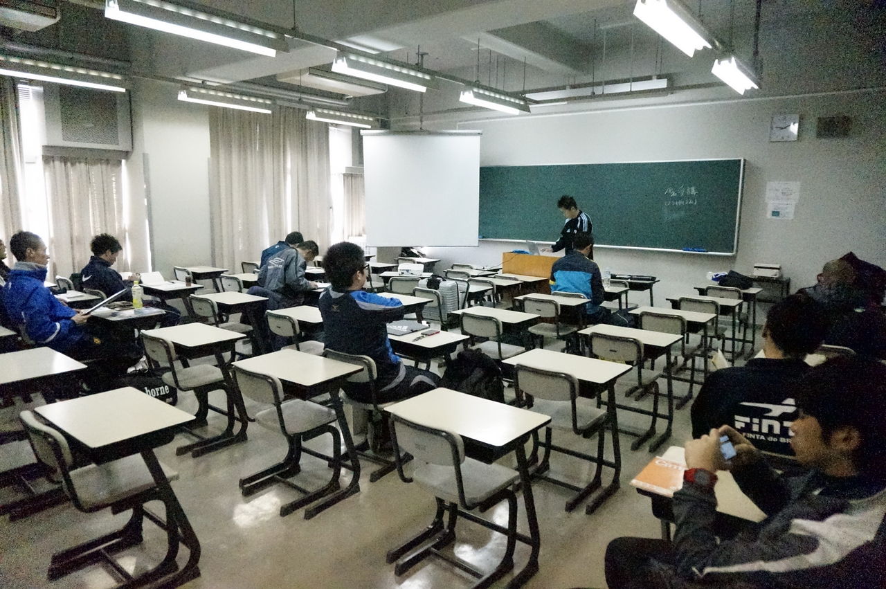 まず座学でU-12の現状を勉強します。試合のビデオなどが放映され、今の子どもたちのレベルを確認します。と言っても、全国少年サッカー大会のビデオだったりするので、とてもレベルの高い子どもたちであることには間違いありません。「こんな子どもたちを下手に僕が指導すると伸びる芽を摘んでしまいそう」と思えるくらい、しっかりしたプレーをする少年たちでした。