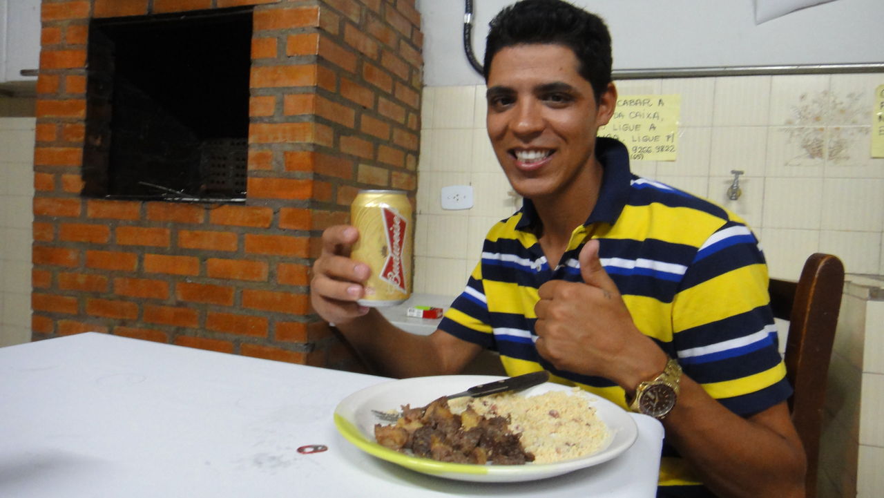 話し込んでいると、一人がこんな料理を持ってきてくれました。すじ肉を焼いて、米の粉(?)を振りかけて食べるブラジル料理。