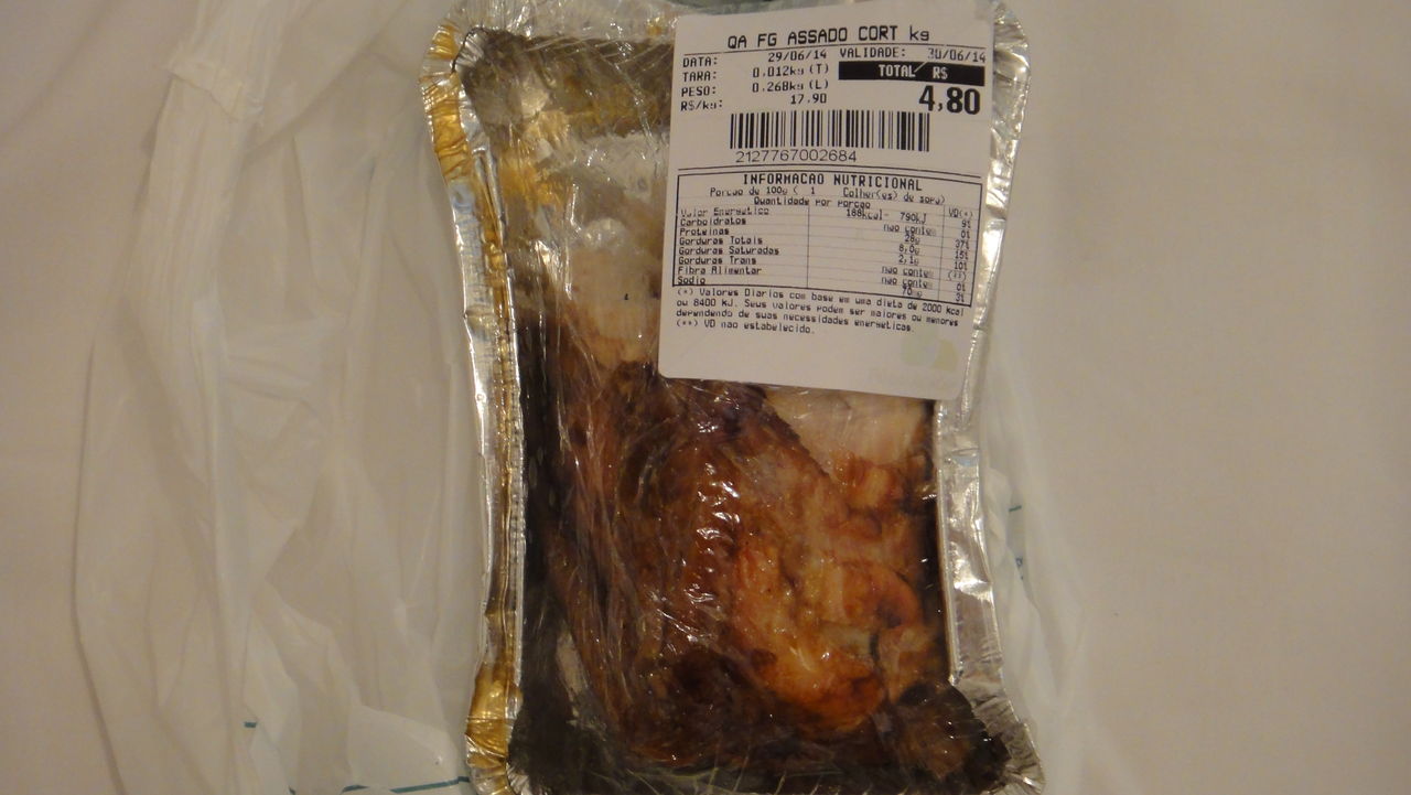 こんがりローストしてある鶏肉が4.69レアル(約240円)。日本でもスーパーでブラジル産の鶏肉を見かけますが、やはり安いようです。