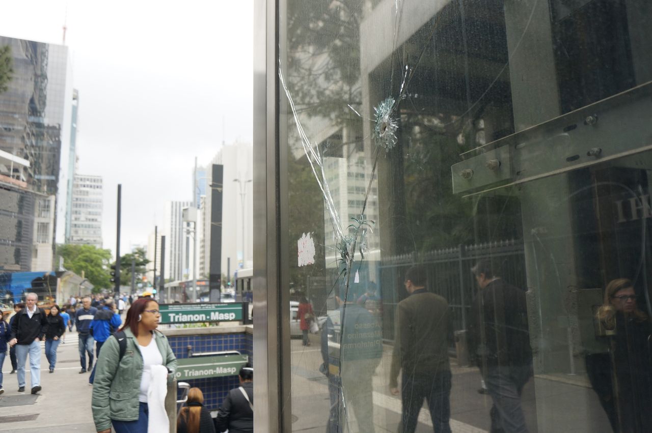 ガラスに穴が。どう見ても弾痕です。オフィス街といえど安心してはいけないのかもしれません。