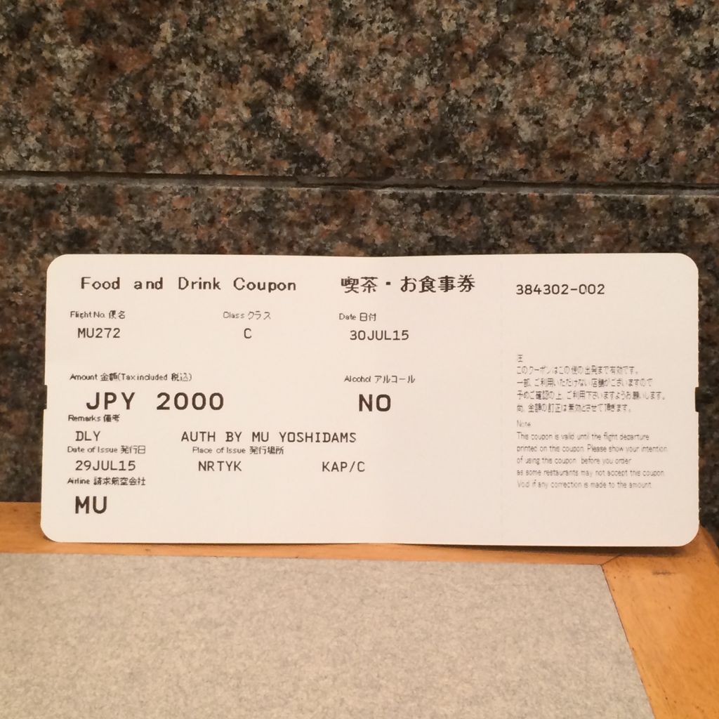 さっそく飛行機が遅れています。新しい出発時間は12:40。そのおかげで2000円分の食事チケット