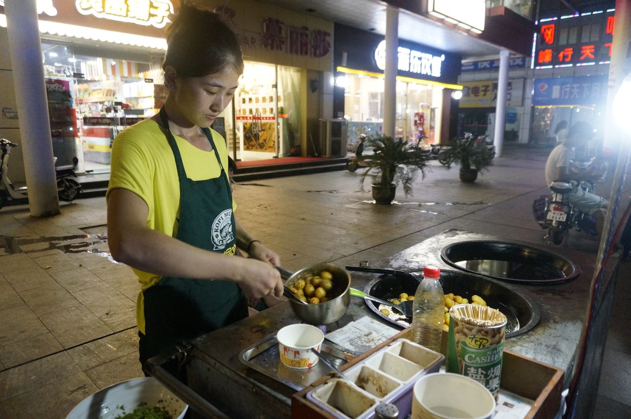 昼間から夜までずっと働いている屋台の女性がいます。彼女が売っているのは小さなジャガイモ炒め。1パック5元(約110円)を、その場でナベで温めているのです。