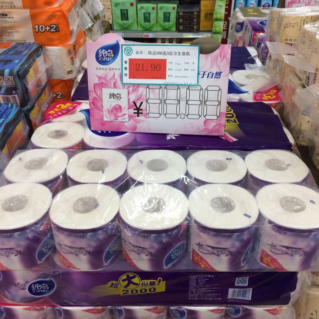 このトイレットペーパー10個が定食よりも高いのです。同じスーパーではスイカ1個が10元(220円)で売っていました。ですから値段の高い店というわけではありません。売っている量、つまり供給量が少ないのかというと、山積みになっていましたからそうでもないようです。