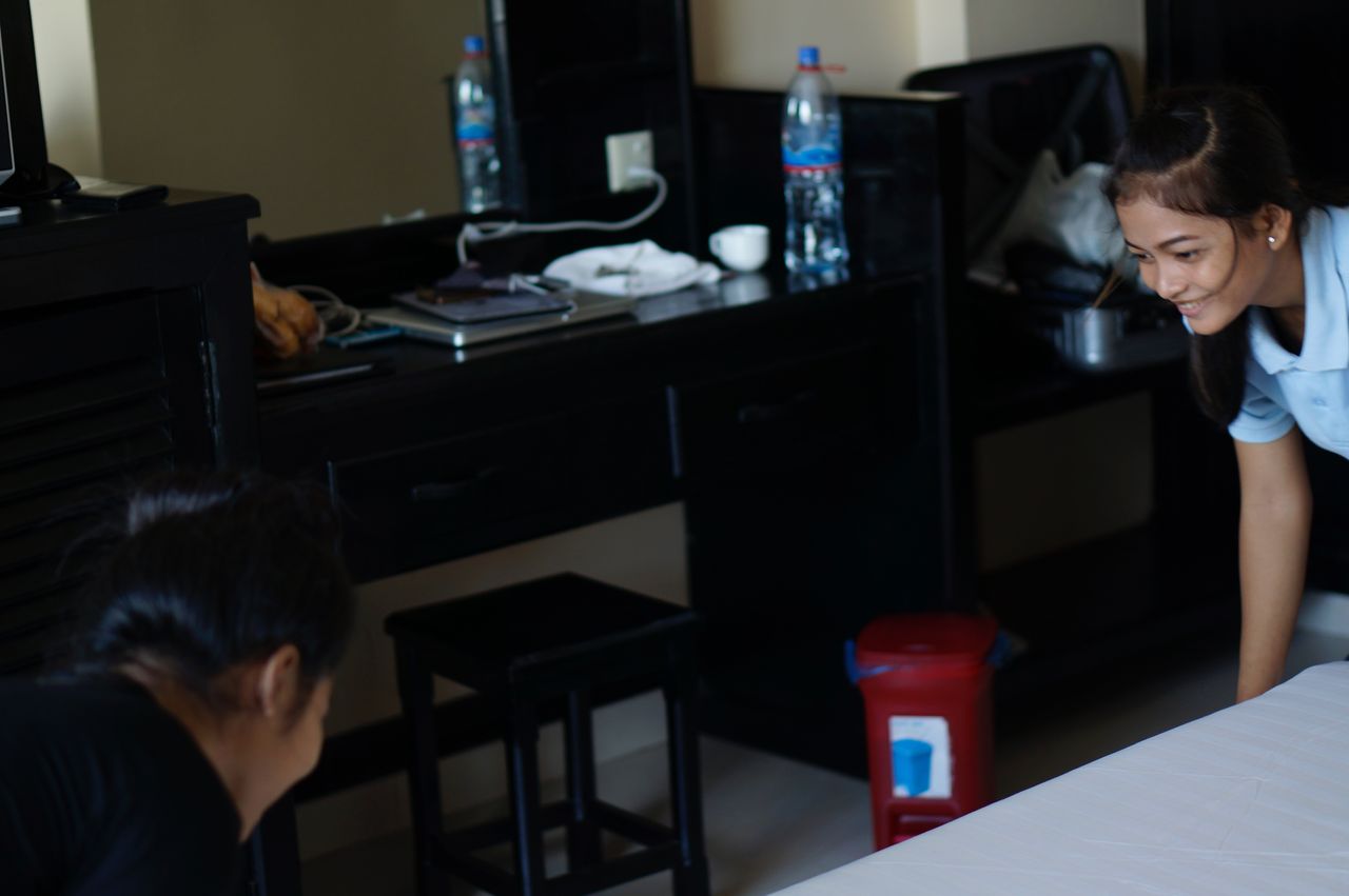 部屋に戻ると、廊下の隅に座っている女性たちがいます。どうやら部屋の清掃係さんのようでした。ドアにかける「Don’t Disturb」「Clean Up The Room」という紙が僕の部屋にはなかったので、どうすればいいのか待っていたようです。