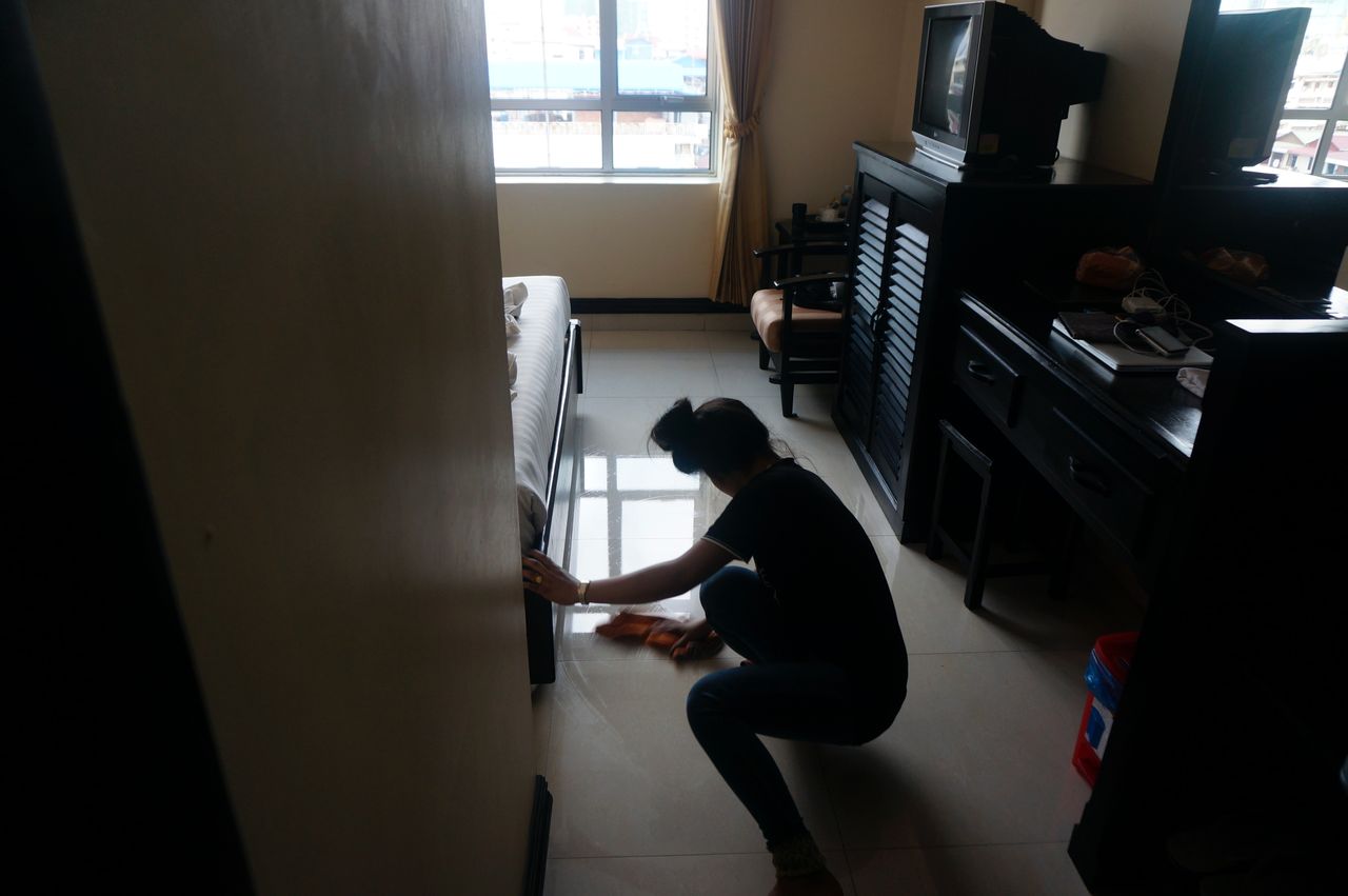 まずはベッドメイク。その後2手に別れて浴室の清掃と部屋の掃除。