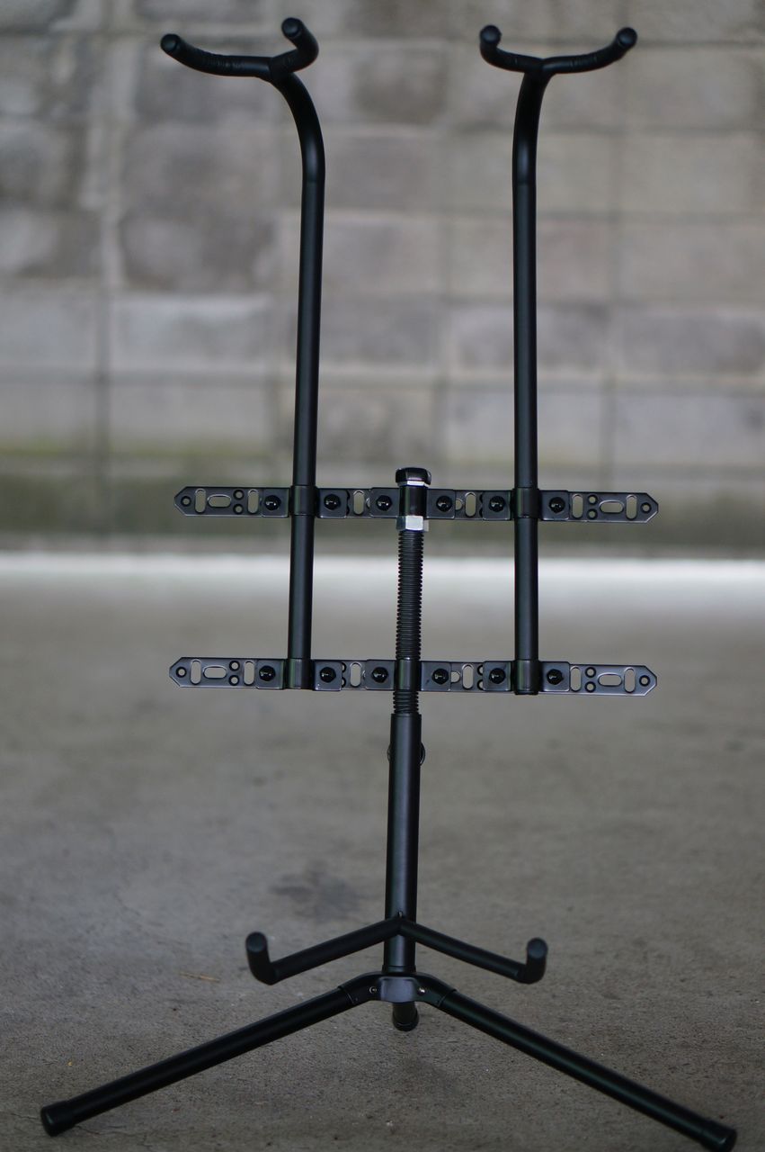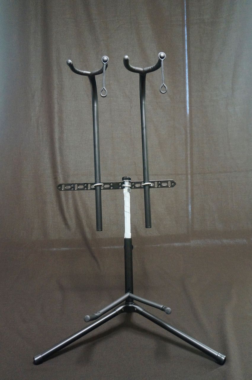 さて、買った後に困ったのがギタースタンドです。ダブルネック用のスタンドなんて置いてないし、そもそも作っているのかどうか……。ということで、普通のスタンドを2つ買ってきて自作です。