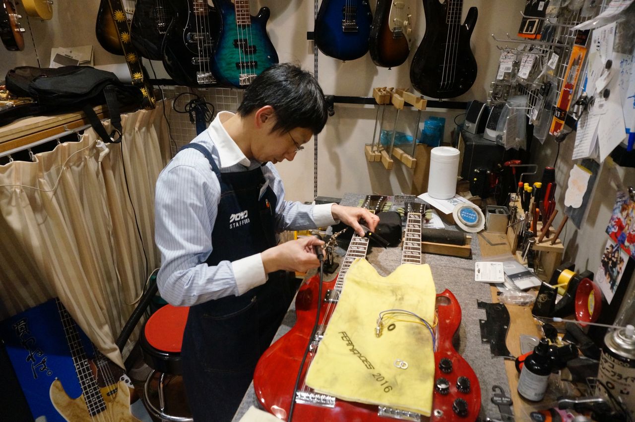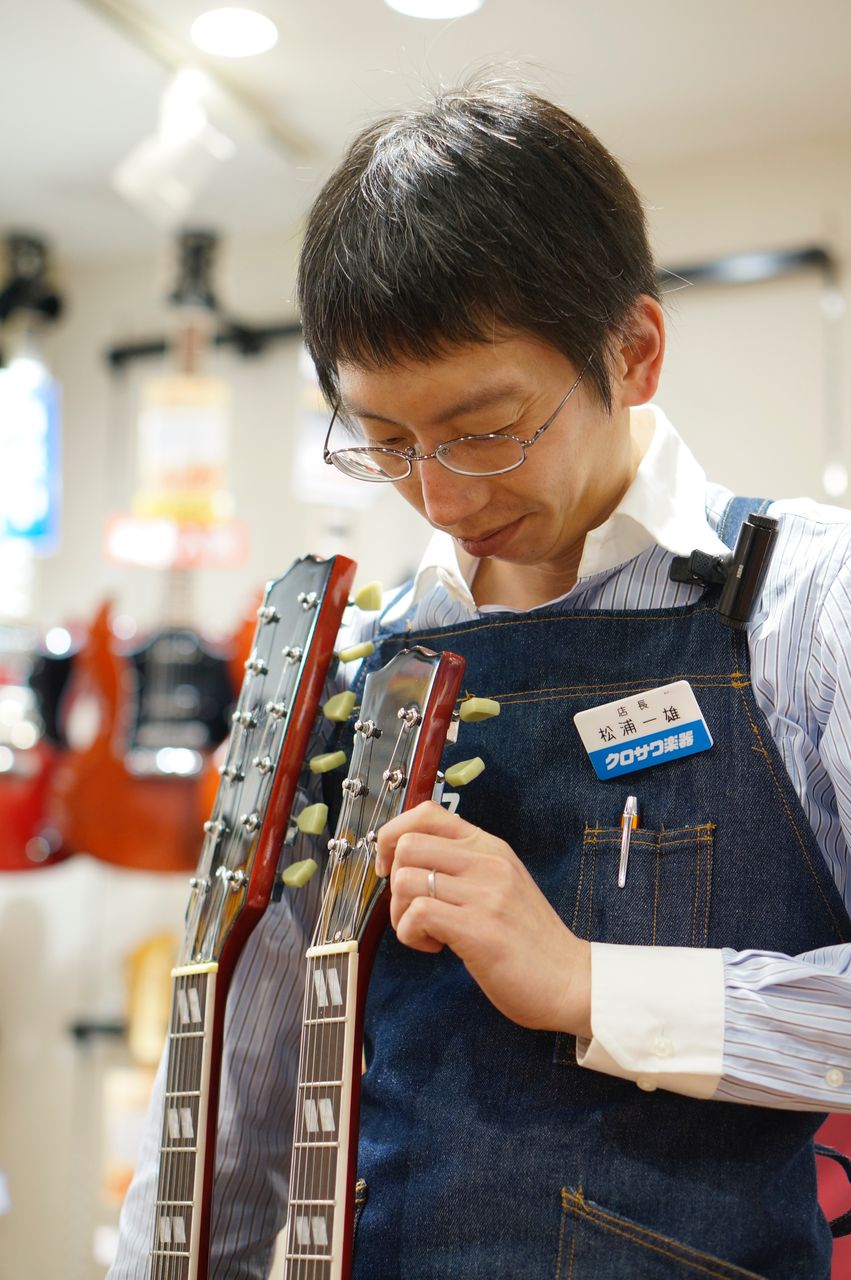 ここで店長の松浦一雄さんにいろいろ見方を教えてもらいました。一言で言えば「細部は甘い」とのこと。隙間があったり、フレットに削る目標となる赤い印が残っていたり。ピックアップの高さが違っていたり、フレットの浮きもあるようでした。