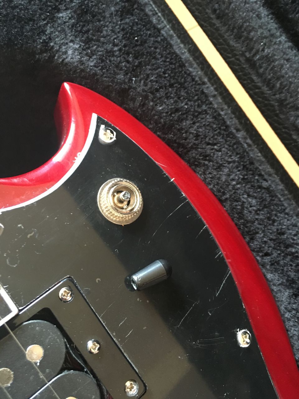 スイッチ折れてます(涙)。とりあえず6弦のほうだけチューニングして弾いてみると、音がびびってます。これは調整しないとダメなのでしょうが、自分でやる自信はありません。