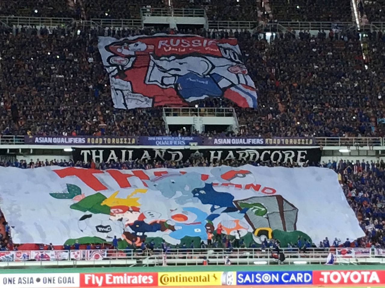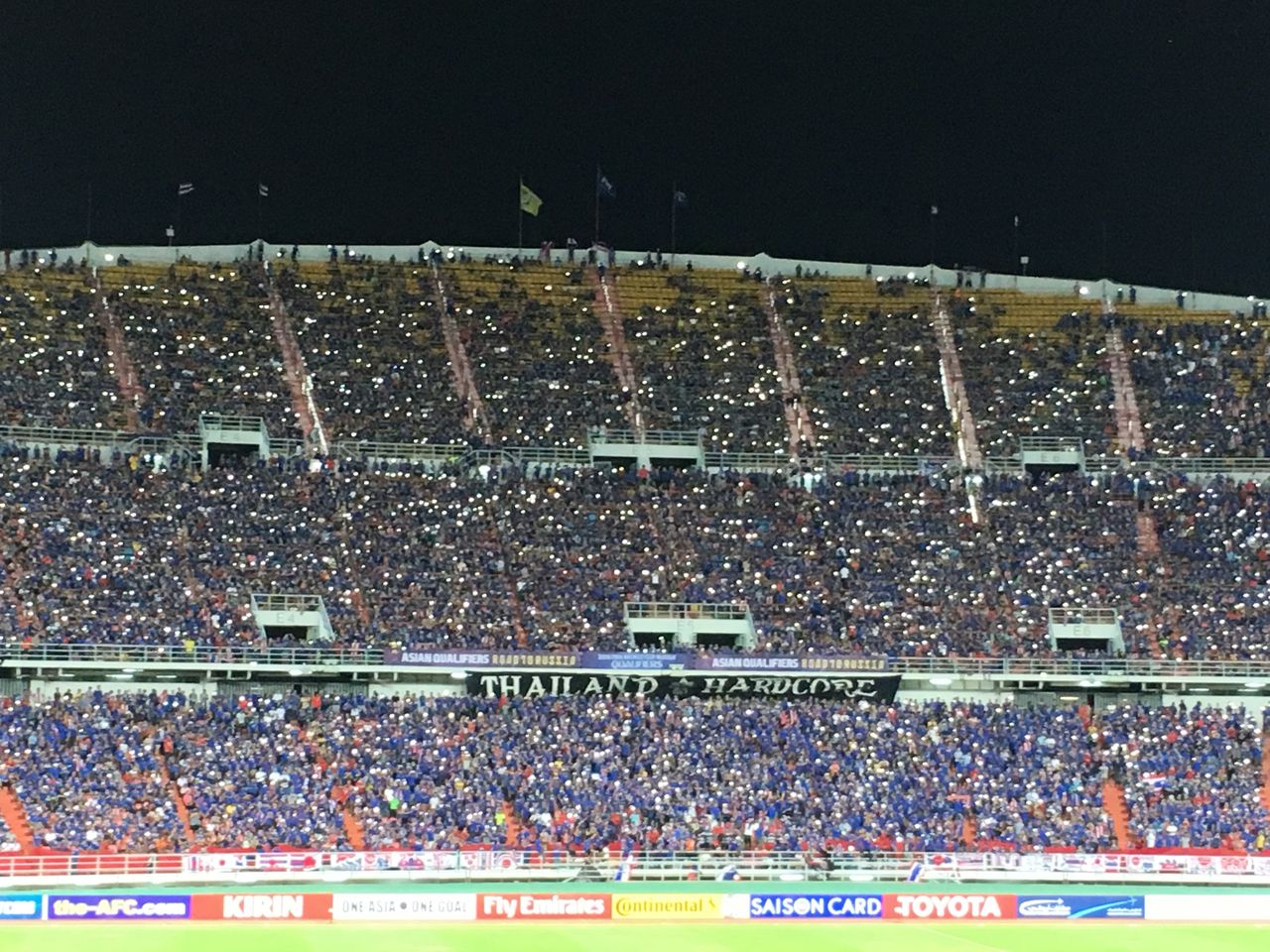 中心になっていたのはホームゴール裏、バックスタンド中央下「THAILAND HARDCORE」、アウェイゴール裏上段「ULTRAS THAILAND」の3カ所。ホームゴール裏とULTRASの掛け合いはなかなかでした。HARDCOREのグルーブ感はいろいろなヒントになりそう。