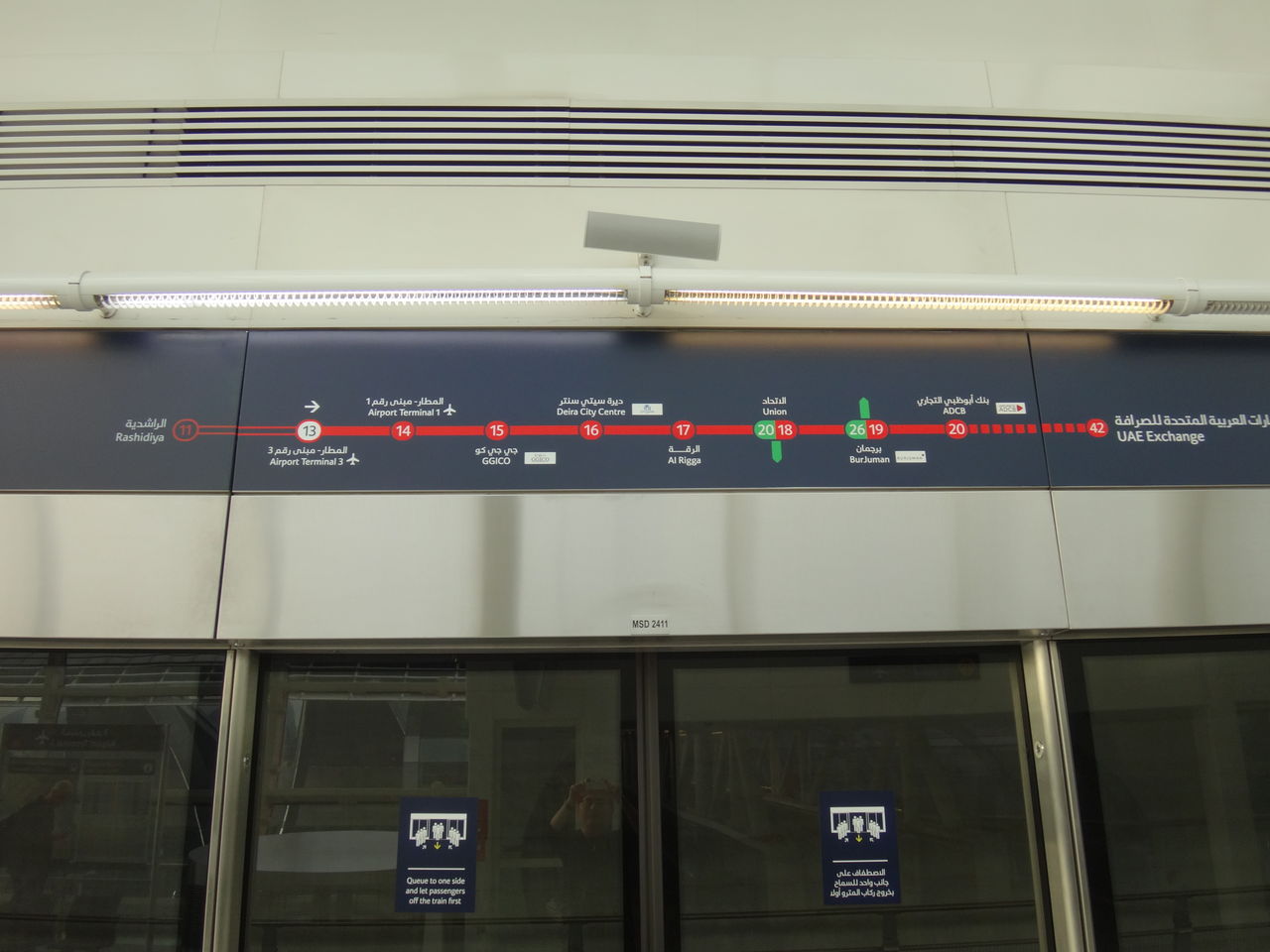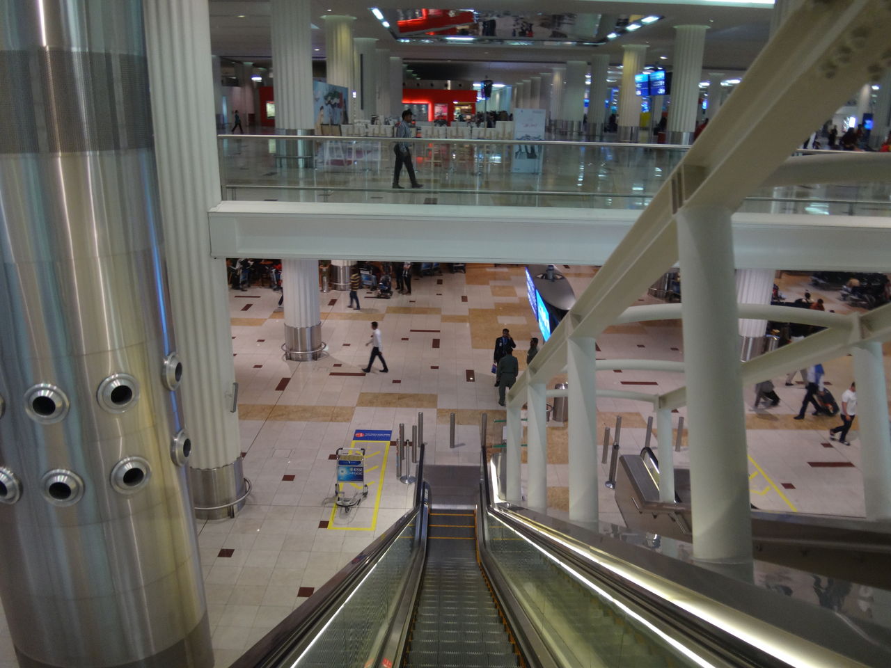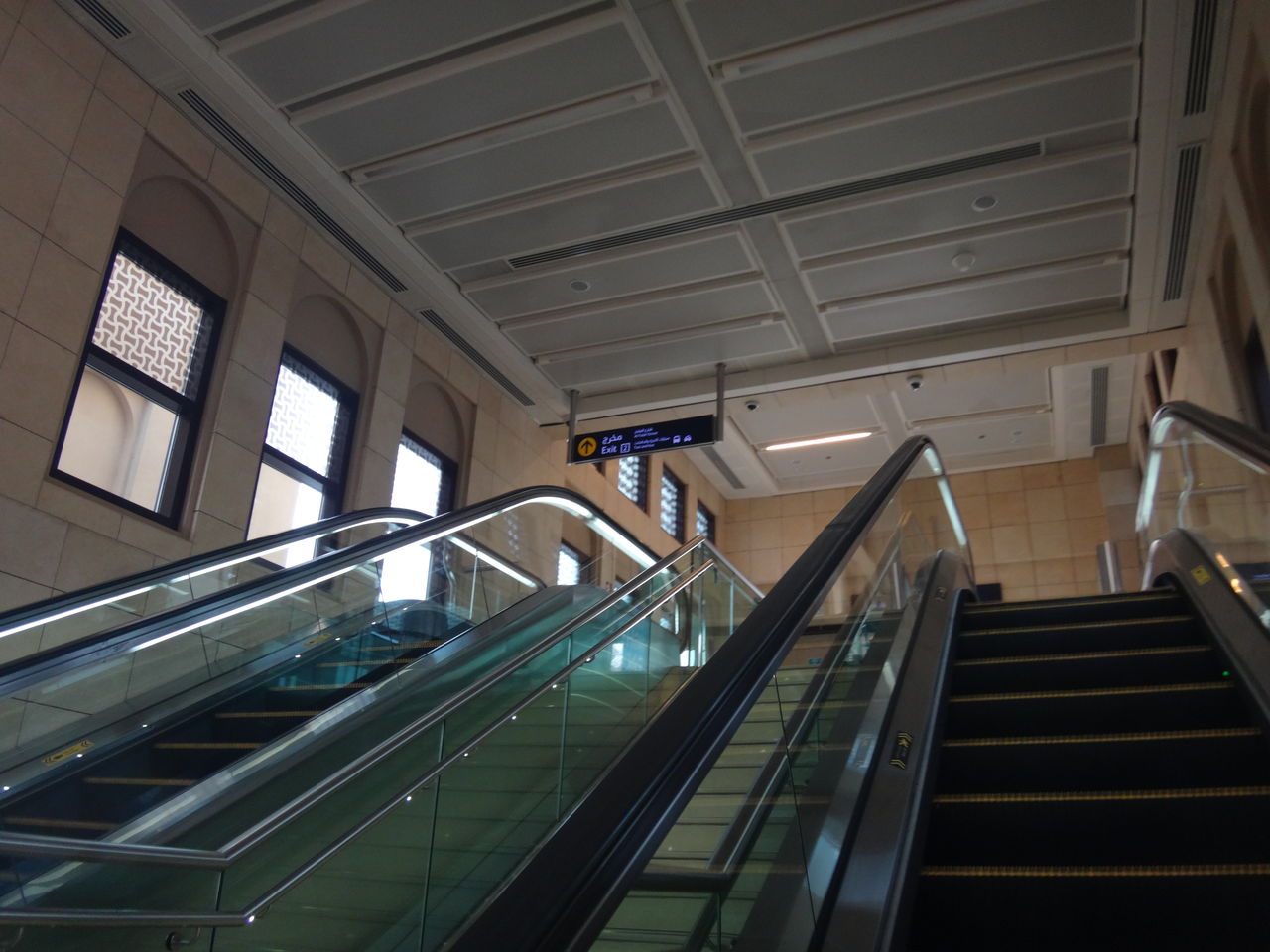 インフォメーションの女性に聞いたところ、メトロの「ユニオン」駅で降りるとバス停があると言います。まず、ドバイ国際空港のエスカレーターを「登って」メトロを目指します。