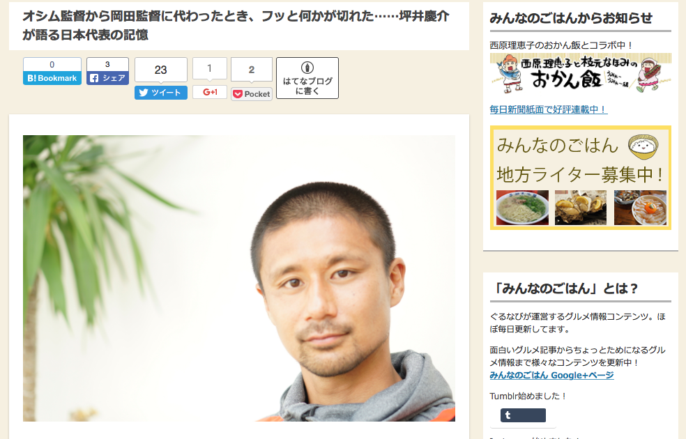 坪井慶介選手については、ずっと疑問に思っていたことがありました。どうしてあんな急に日本代表を辞退しようと思ったのか。初めてJ2でプレーするというのはどんな気持ちなのか。そして2006年ワールドカップで、なぜスタミナたっぷりの選手の足がつったのか——。