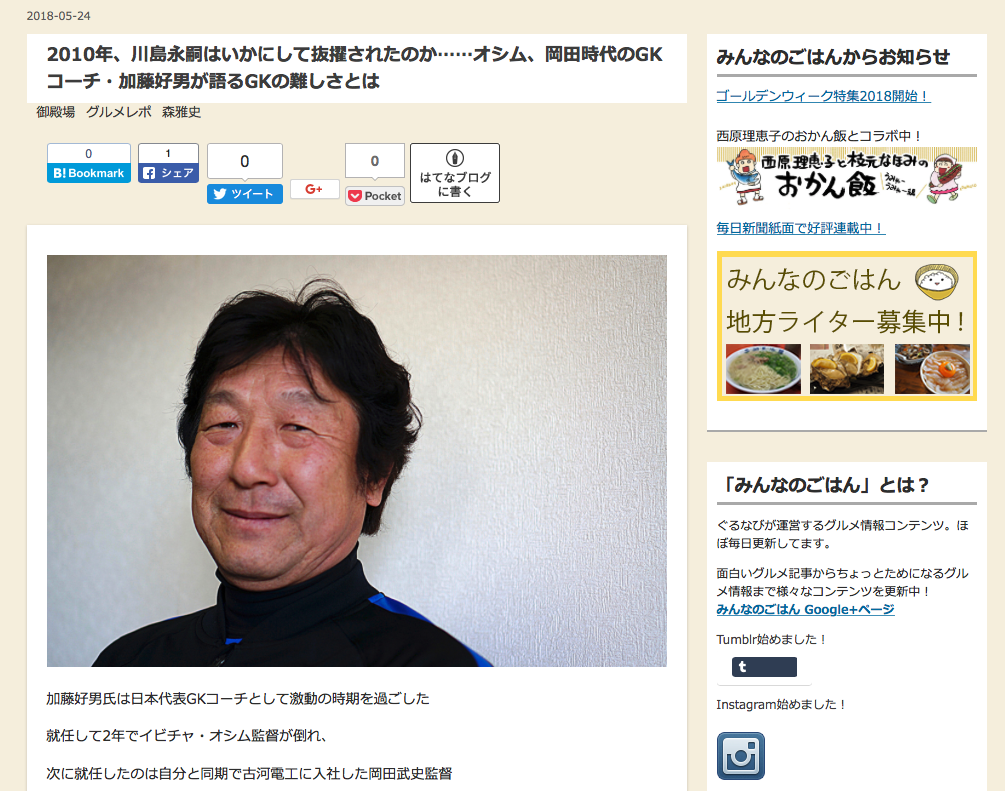 今回はワールドカップ前ということで、南アフリカ大会のGKコーチだった加藤好男さんにお話を伺いました。加藤さんは何を見ていたのか。そして川島永嗣の抜擢はどうやって決まったのか。そこまでの過程は、加藤さんの歴史にもつながるものでした。