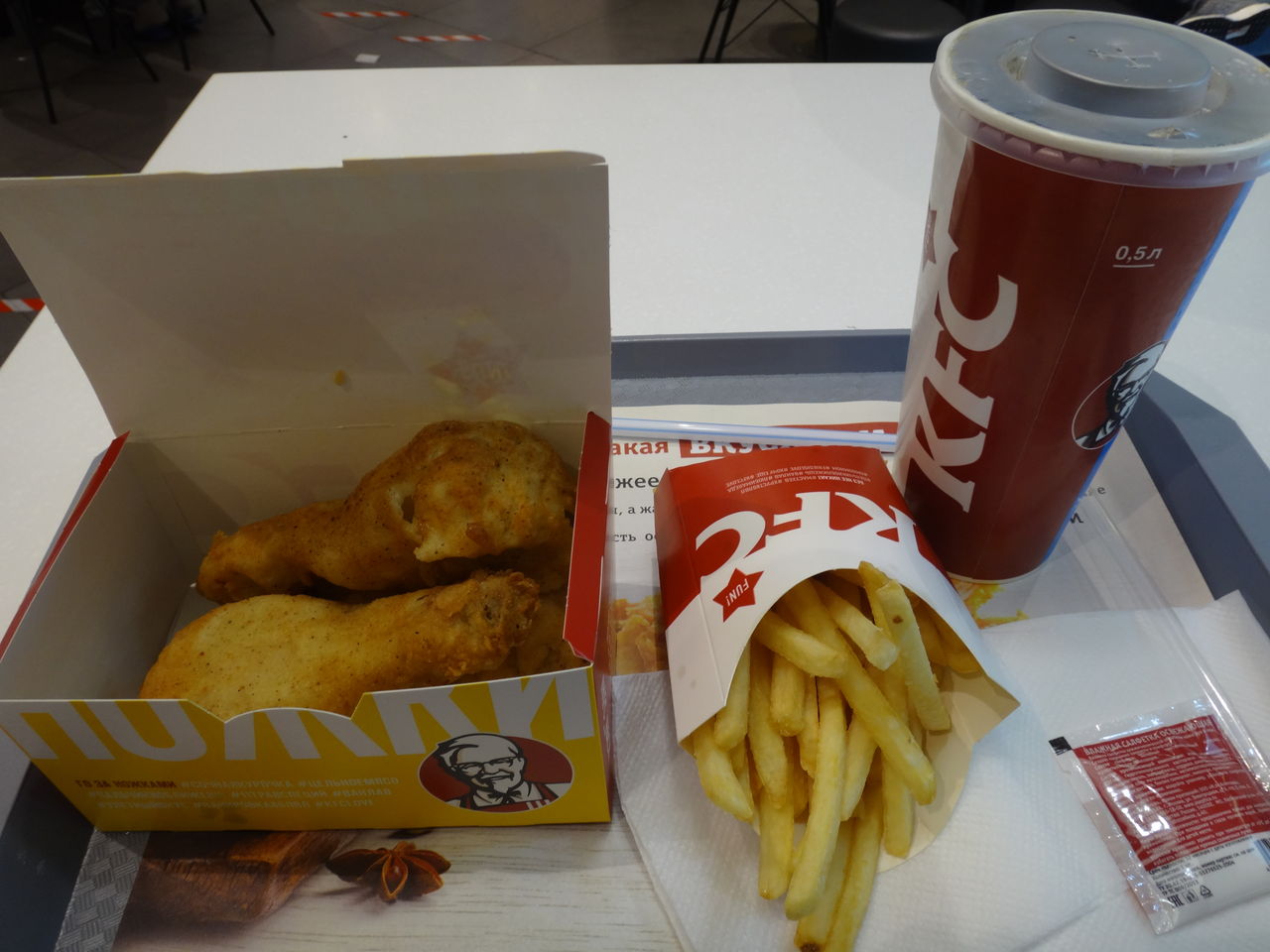 ドラム肉3本、ポテトMとドリンクM(500ml)。 ドラム肉は日本よりボリュームたっぷり。これでなんと480ルーブル!! あれ? 約960円もする? これだと日本と変わらないですね。うーん、失敗だったか。