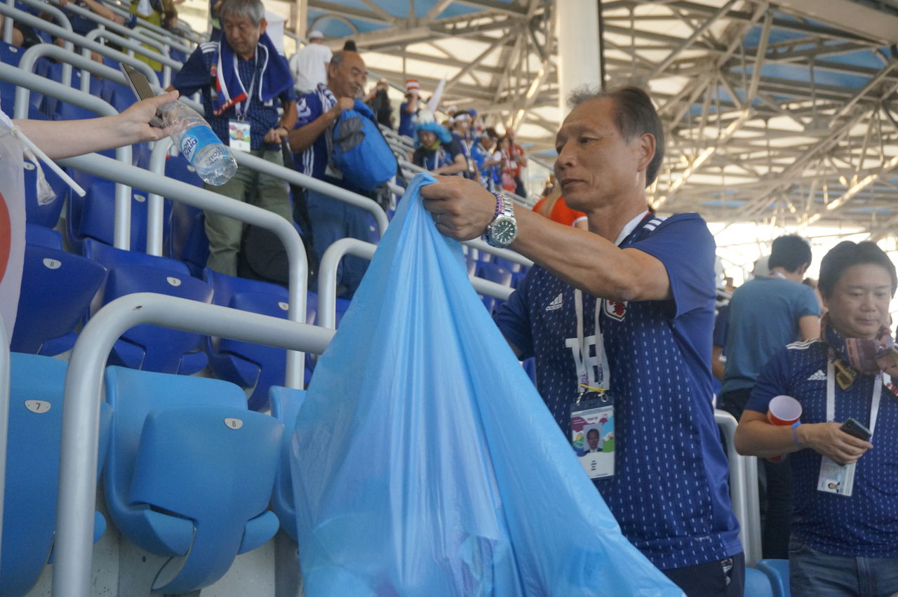 ポーランド戦の後にゴミを拾う原博実Jリーグ副理事長、日本サッカー協会常務理事。ポーランド戦の最後の終わらせ方が論議を呼びましたので注目されることは少なかったのですが、これはちょっとした天気ではなかったかと思います。