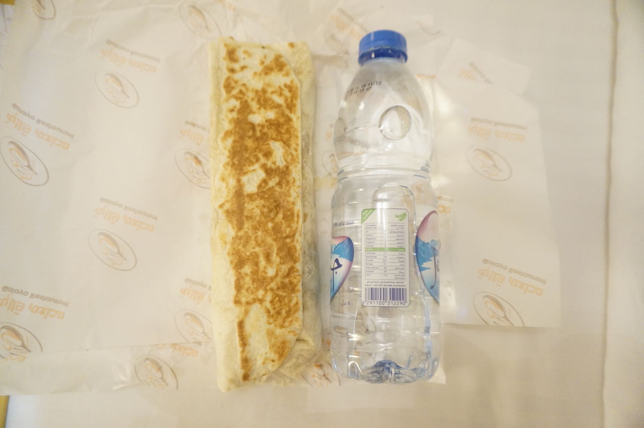 これが「サンドイッチ」という名前で売ってました。11AEDで、約350円ぐらいという感じでしょうか。中身はドネル・ケバブと同じです。牛肉か鶏肉か選べて、スパイシーかどうかを指定します。野菜もたっぷり入っているから、健康にも悪くなさそう。そう思いたいだけなんですけど。
