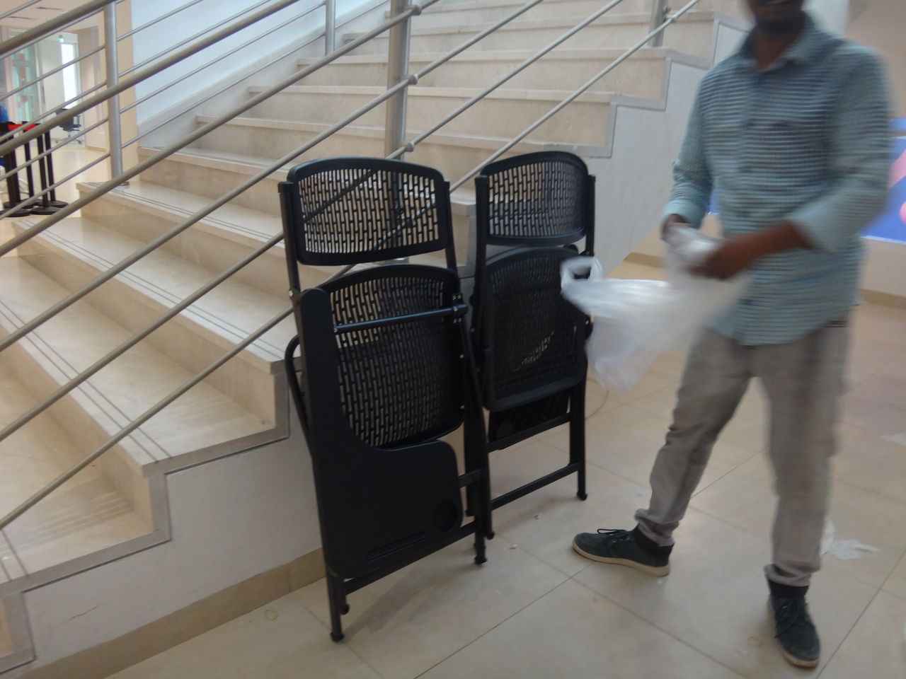 記者会見室用に新しい椅子を用意しているところ。試合当日には珍しい風景です。どうやら日本の報道陣が多いからと言うことで急きょ用意したようです。
