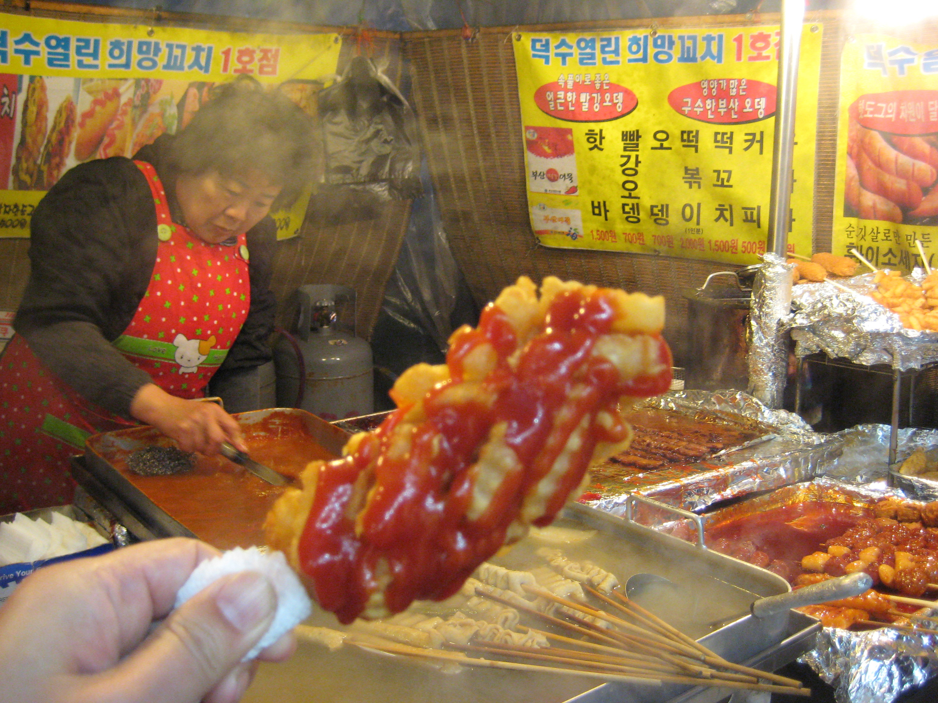 これはソーセージの周りにポテトを絡めて揚げたもの。他にも辛いソースの食べ物があったのですが、おばちゃんが売ってくれません。どうしても、というとソースだけをカップに取ってくれました。その場にいた人たちがワクワクしながら見ています。一口すすると、やっぱり辛い! みんな大笑いです。ただ、2006年以降、辛い食べ物への耐性を多少身につけたので、次の一口で一気に飲み干すことができました。今度はみんなが喝采。おばちゃんも納得して売ってくれました。
