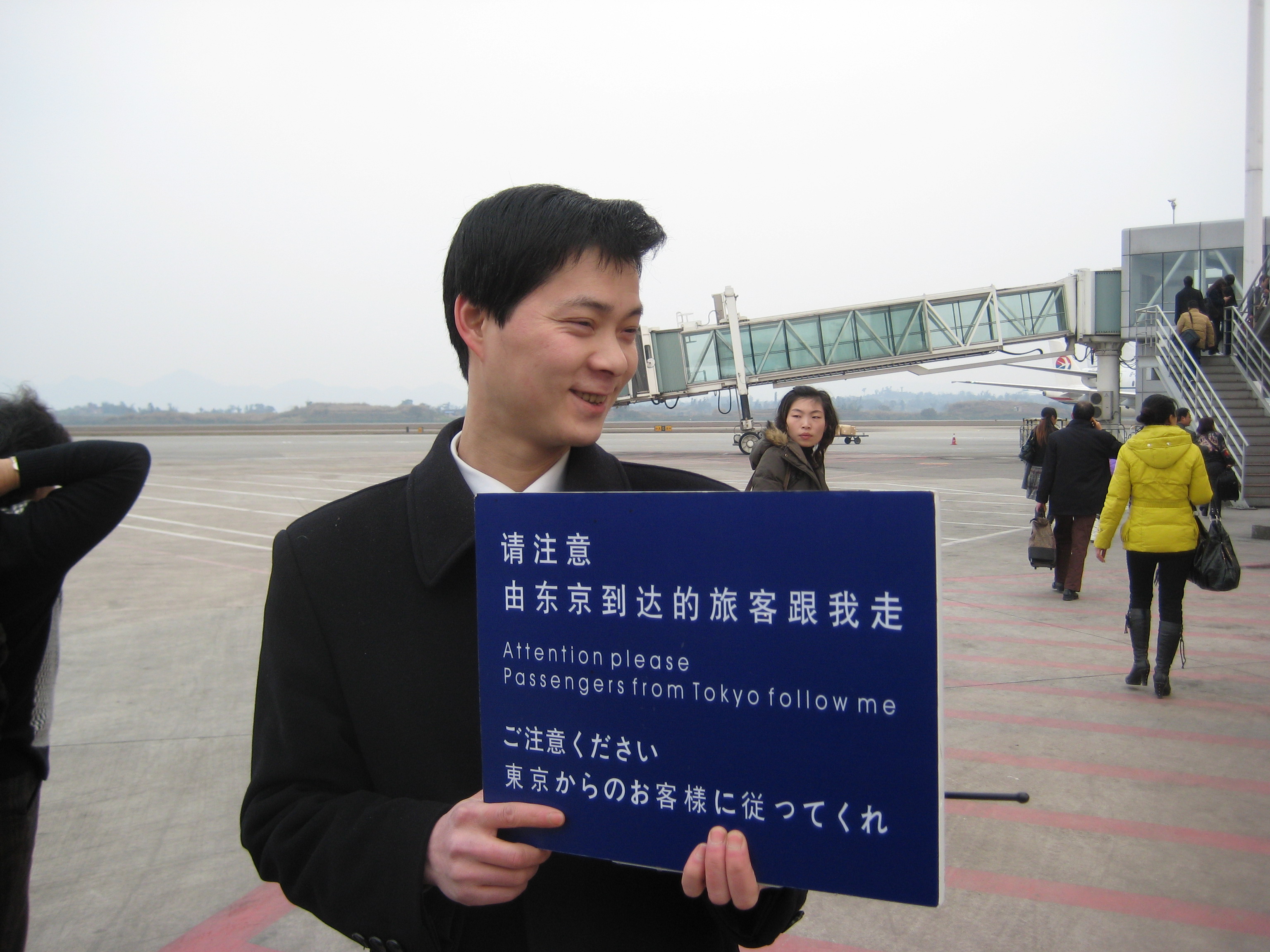 上海でタラップを降りると案内の係員が立っていた。出しているプレートには「ご注意ください」と書いてあるあとに「東京からのお客様に従ってくれ」とある。誰だ、こんな変な言葉を教えたのは。しかも誰に従えばいいんだ。もしかして先頭で降りたオレか? オレが重責を担うのか! と思ったけど当然のように違った。